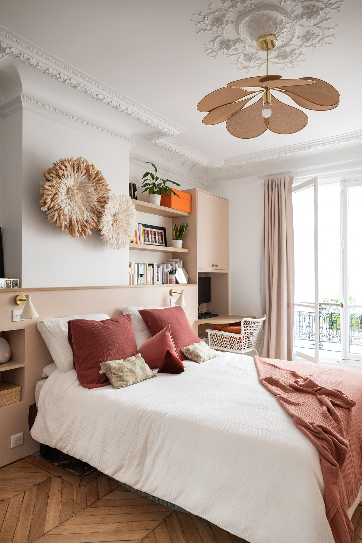 暖炉の煙突部分を活かした、オーダーメイドのヘッドボードを備えた寝室。photography: Agence Smilzz