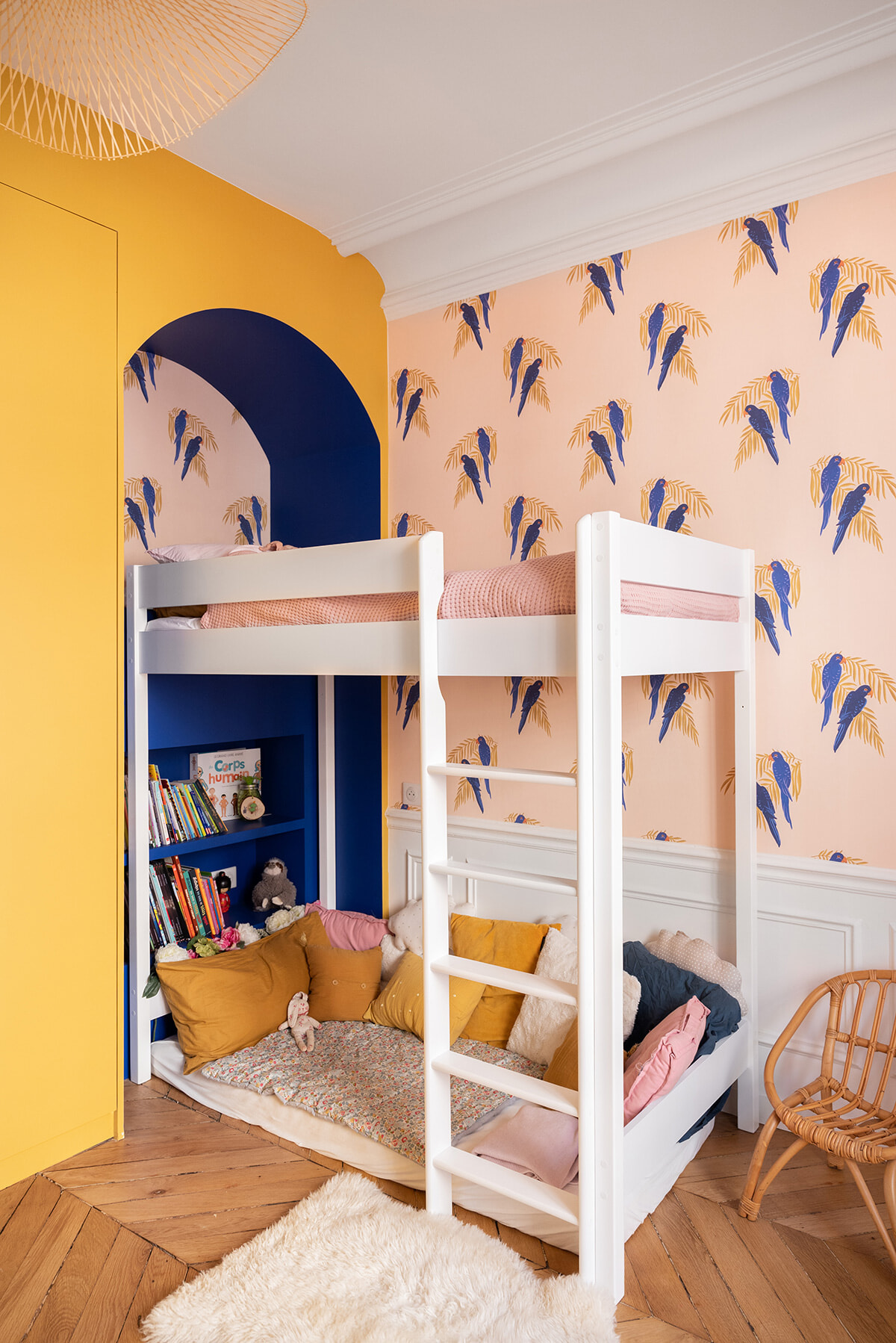 「子ども部屋へはリビングからアクセスします。両親の寝室とは対照的に、子ども部屋では天井までの高さを活かした収納を最大限に設けました。収納にはIKEAのキャビネットをベースに使い、それをセミハードボードで囲い、塗装仕上げにしています。さらに、一部は特注の木工家具も組み合わせて空間を仕上げました。女の子の黄色い部屋では、クライアントが『いまあるベッドを残したい』と希望されたため、それを基準にレイアウトを構成し、小さな本棚とベッドヘッドを追加しました。ベッドヘッドは読書灯などを置けるようにデザインされています。」