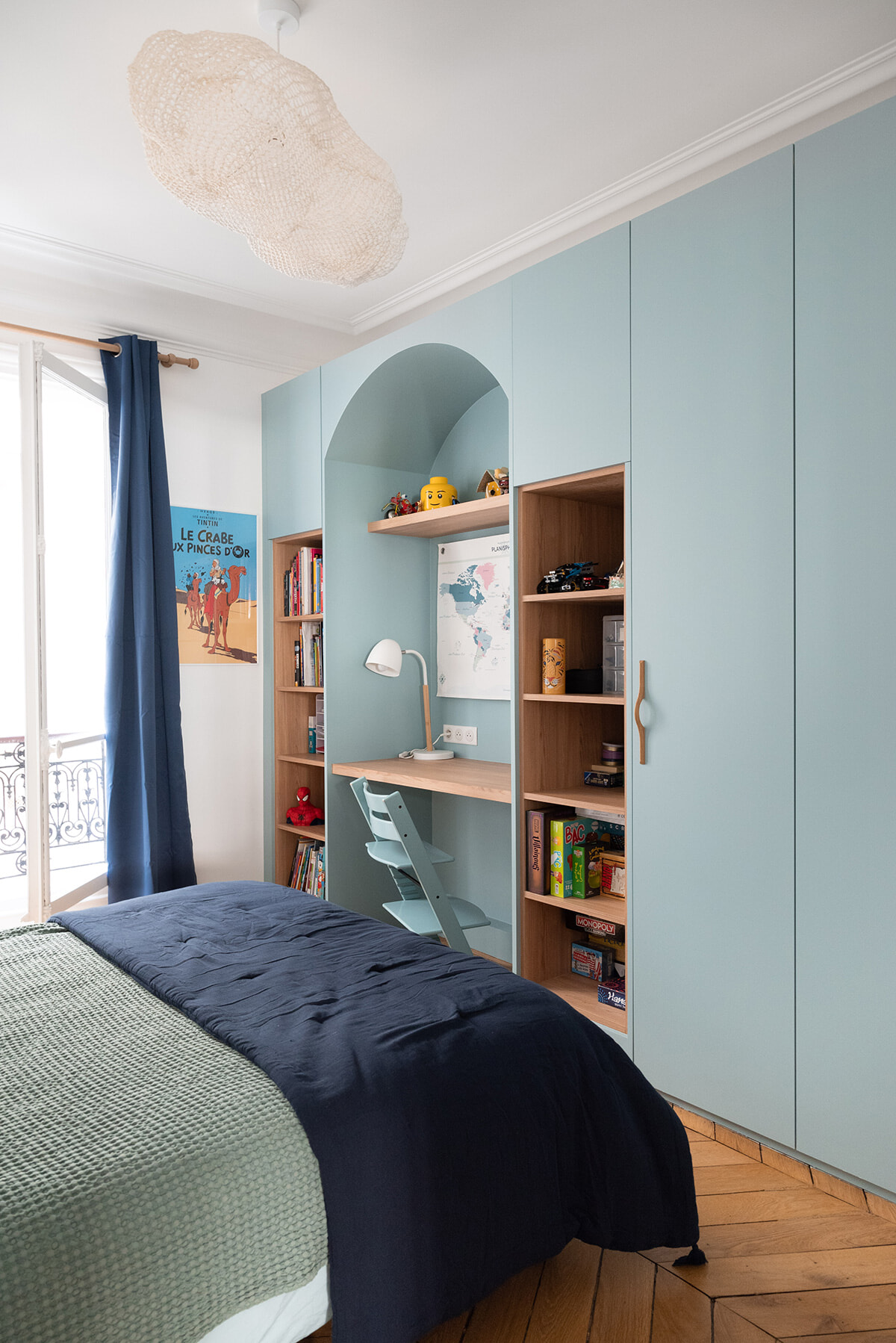 オーダーメイドの収納にデスクを組み込んだ男の子の部屋。photography: Agence Smilzz