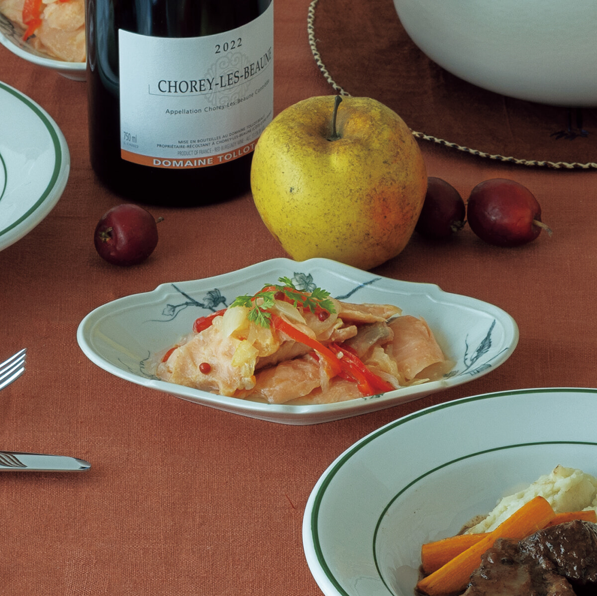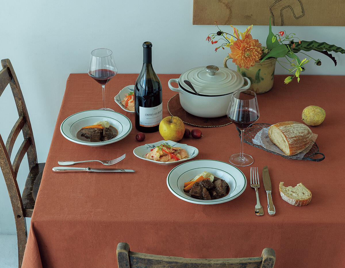 友人を招いての着席ディナーなら、前菜、メイン、チーズにデザートが定番。キッチンに籠ることのないよう、前菜はあらかじめ準備するのが基本。メインは事前に用意して温めるだけのオーブン&煮込み料理にし、ゲストとの会話を愉しむ。