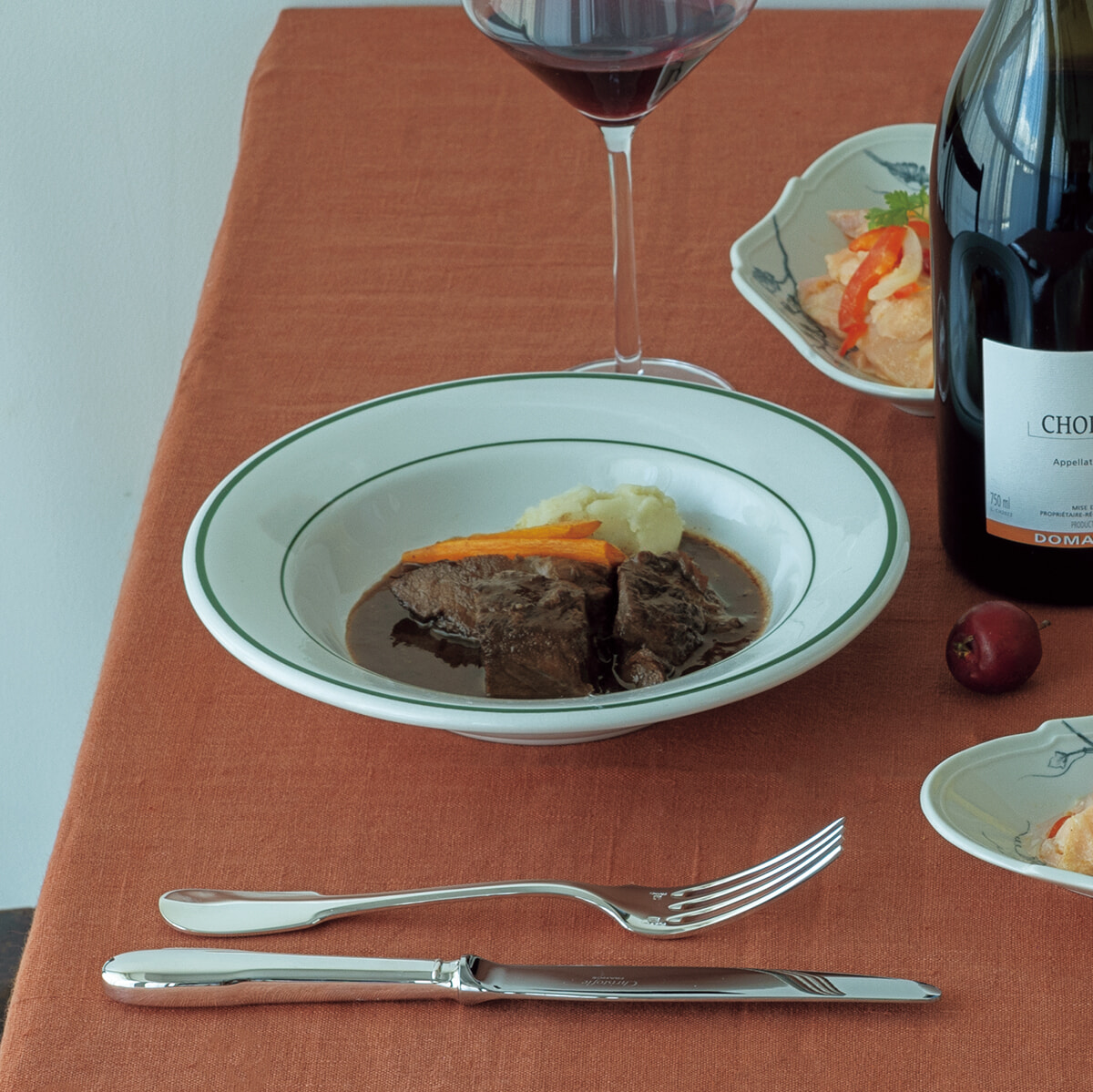カトラリー「クリュニー」テーブルナイフ 各¥14,850、テーブルフォーク 各¥12,650/以上クリストフル 青山本店 鍋「ル・クルーゼ シグニチャー ココット・ロンド 20cm メレンゲ(シルバーツマミ)」¥38,500/ル・クルーゼ ジャポン フランスアンティークのジャグ¥17,600/フィネスタルト その他/スタイリスト私物