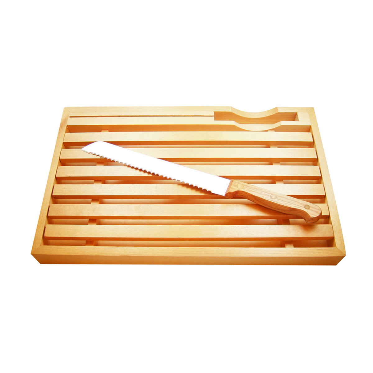 バゲットやカンパーニュが主食のフランスでは、専用ナイフと、スノコ付きプランシュ(まな板)が必需品。セットのナイフがボードの溝に収まる設計に。