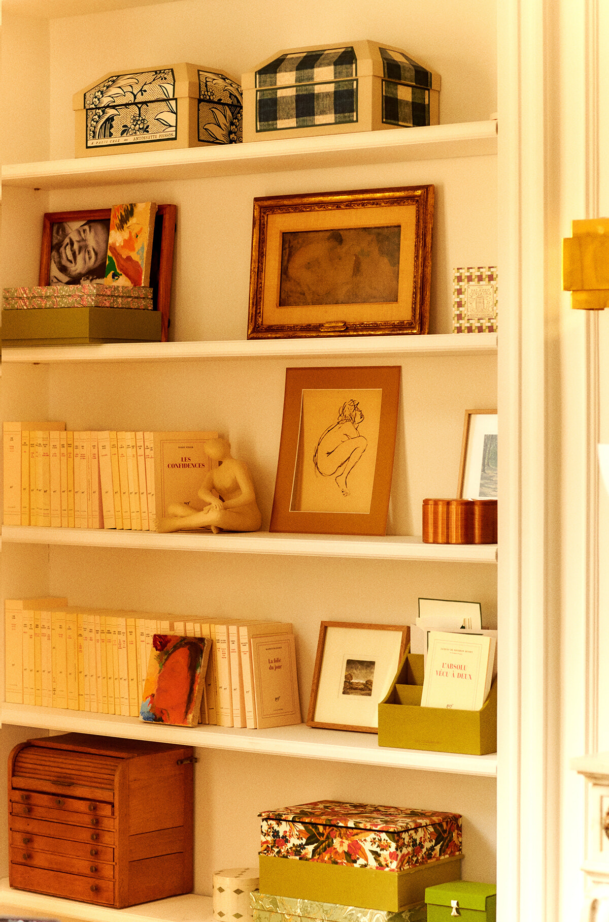 ヴィンテージのデスクとノルの椅子の横に置かれた書棚には、アントワネット・ポワソンのボックスや、ジュリー・ジブロ・デュクレイの小さくてカラフルな絵画、ゲノレ・クルクーの彫刻「La Femme(女)」、レ・コンポザンのレターボックスなどがディスプレイされている。
