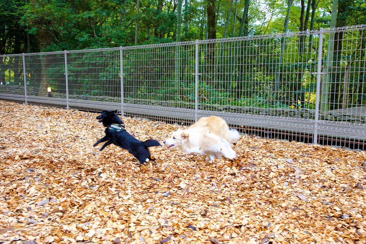 くぬぎと竹林に囲まれた木陰に造られた広いドッグラン。ウッドチップを敷き詰めた全犬種用と小型犬優先の2つエリアで構成され、犬たちが安心して走り回ることができる。