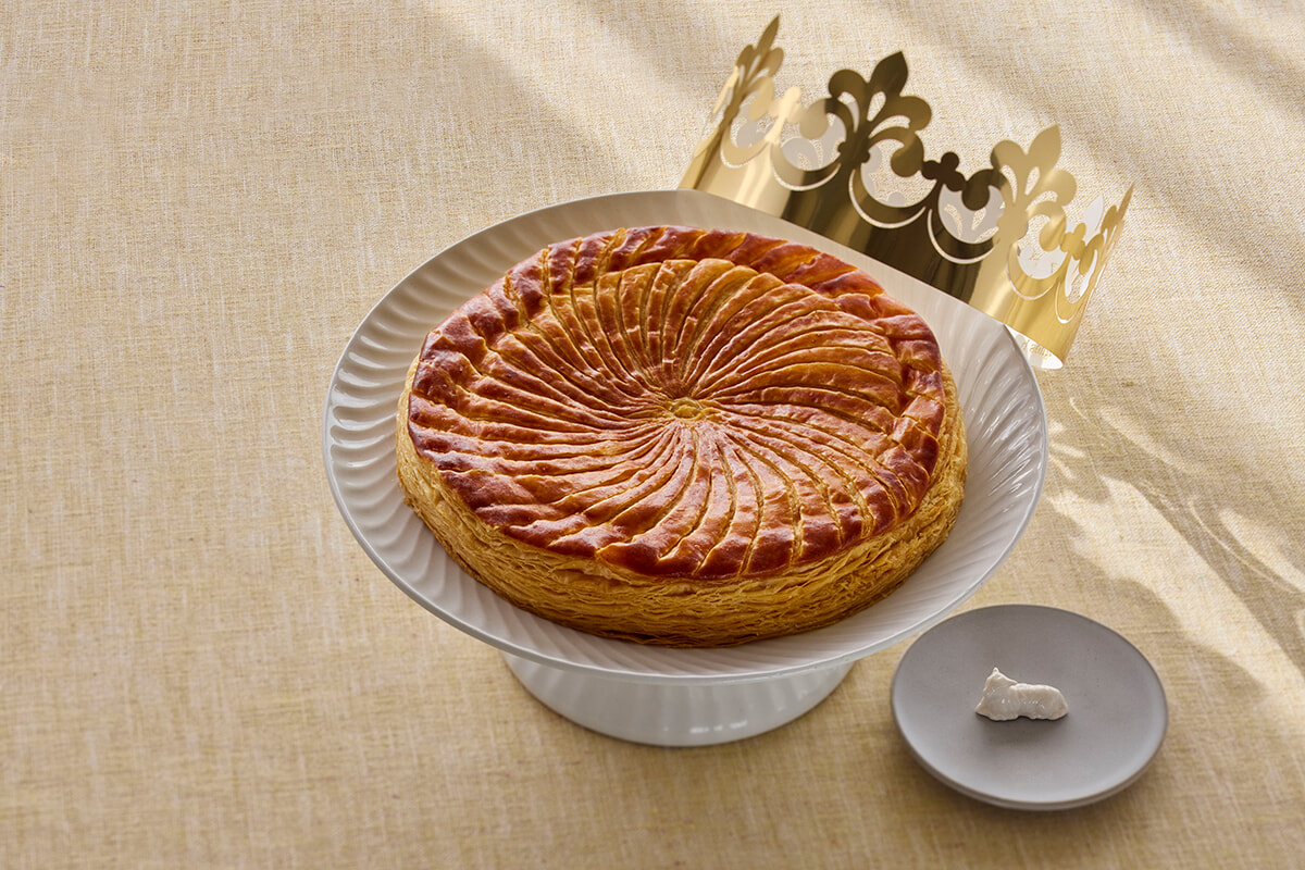 ガレット・デ・ロワは、「王様のケーキ」を意味するフランスの伝統的な焼き菓子。バターたっぷりのパイ生地にアーモンドクリームを詰め、表面に美しい飾り包丁「レイエ」を施し、新年のお祝いで食べられる。ガレットの中には、「フェーヴ」 と呼ばれる小さな陶器のオブジェが……! 当たった人は、その日一日紙製の王冠を被って「王様」として祝福され、幸運な一年を過ごせると言われており、家族やパートナー、友人など皆で楽しみながら味わうことができる。
