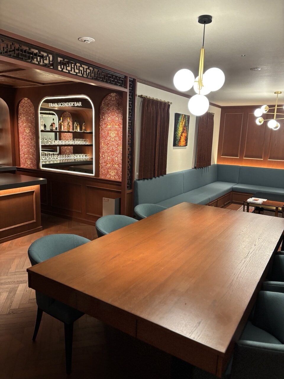 チェックインが終わったら、いちどラウンジで身体を落ち着けて。ロビーの横にあるトランセンダーラウンジは、カウンター、ロングテーブル、テーブル、ソファ席が選べる落ち着いた空間。窓の外、赤いランタンの下を行き交う人たちを眺めていると、気分はだんだんと非日常へ。ロングテーブルに肘をついていると、まるでウォン・カーワイの映画に入り込んでしまったかのような気持ちになってくる。