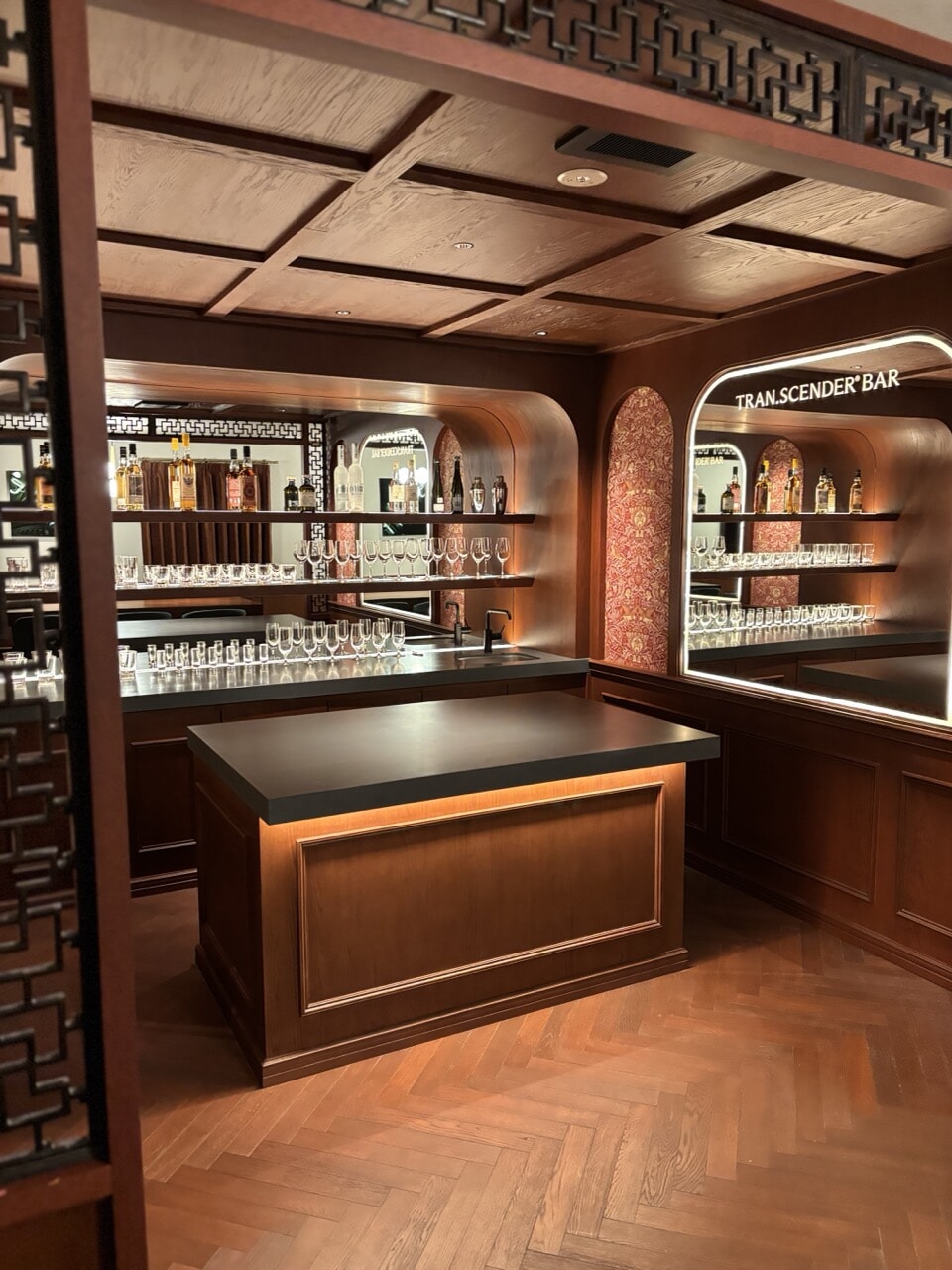 プライベートバーのスペースは鏡張りで、こちらも目眩のする美しさ。透かし彫りで縁取られた空間はいかにもチャイナな雰囲気を醸し出し、カウンターにもたれかかるだけでちょっと「気分」に浸れてしまう。