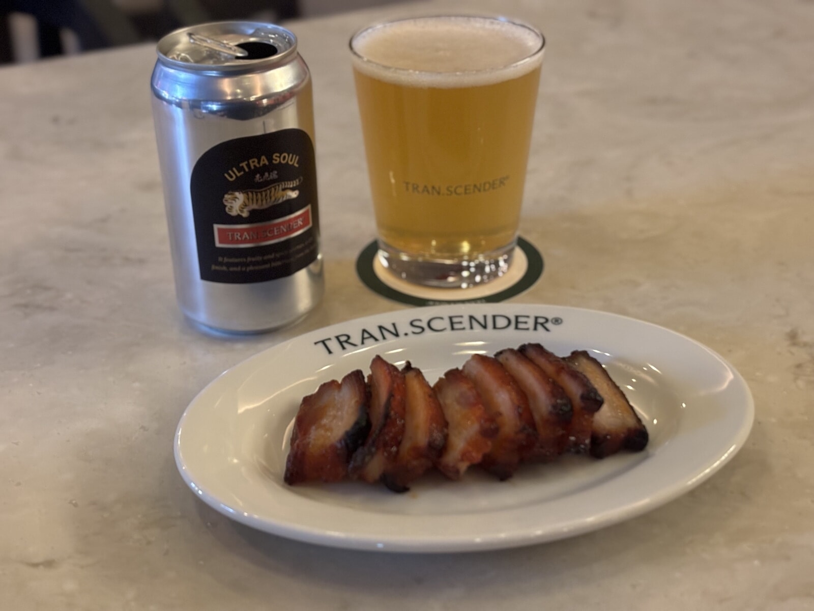 自然派ワインはグラスで楽しめるし、ボトルの赤、白、ロゼ、泡も楽しめるが、アペロにはぜひ「里武士 馬車道」のクラフトビールを。トランセンダーの名前にちなんで「ウルトラソウル」と名付けられた、コリアンダーがほんのり香るほろ苦く酸味の効いたオリジナルビールに、名物のトロ叉焼を合わせて。