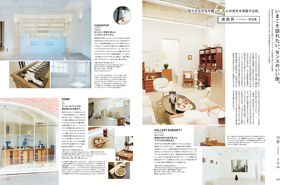 巻頭のソウル特集は話題のエリア漢南洞や新オープンの洗練空間、おひとりさま旅にも最適な食処、手仕事が生きる工芸品のブティックなどを紹介しています。何度目かの渡韓者に向けて、済州島でのアートと触れ合うヴァカンス旅もおすすめです。また、シネフィルとしては、チョン・ウンスクさんおすすめのシネマティックなアドレス@ソウルにもご注目いただきたいです。