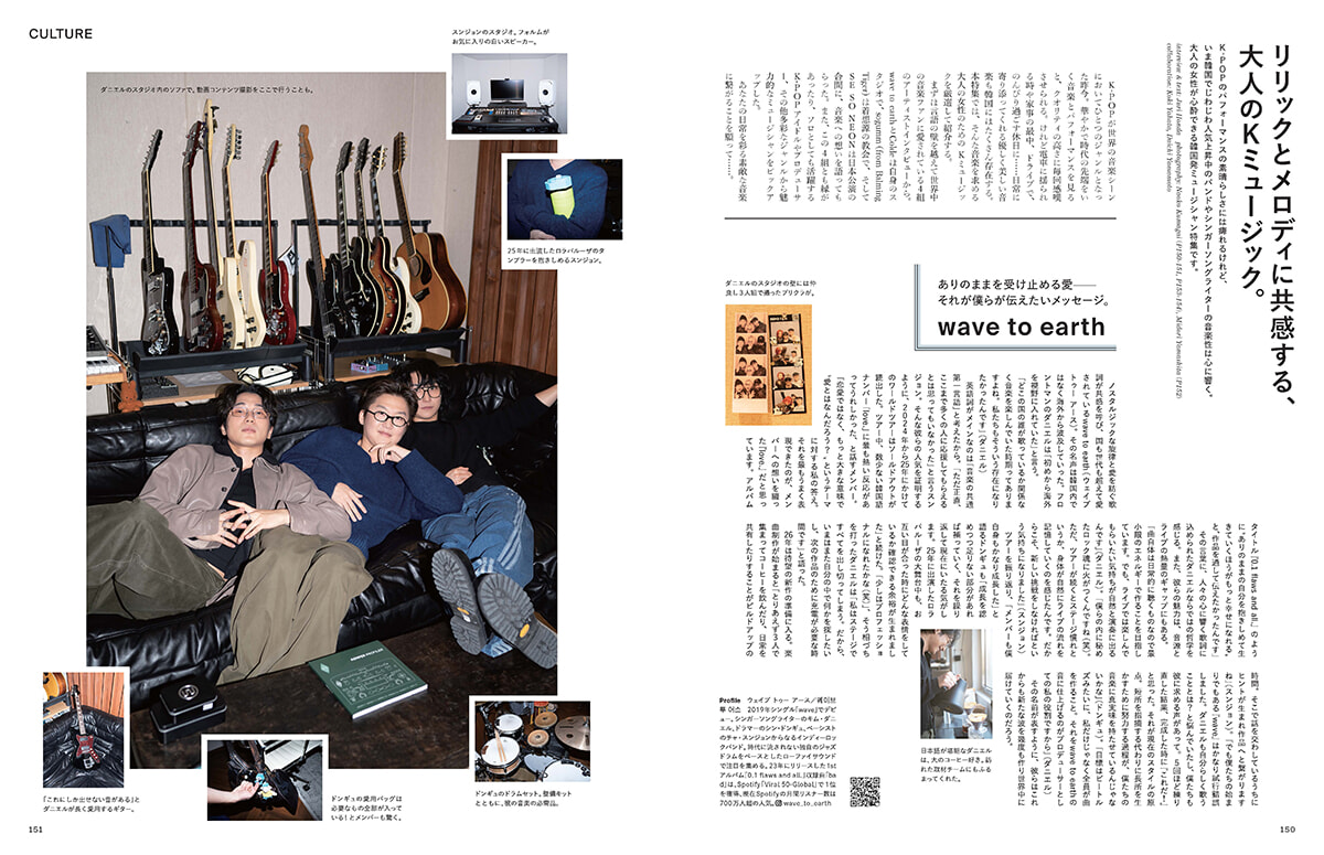 実は渾身のテーマがひとつ……大人も愛するKミュージック特集です。こちらは、以前から大好きだったインディーズバンドwave to earthに会いたくて、自ら出張したテーマでした。彼らの音楽に出合ったのは長寿テレビ番組「世界の車窓から」を休日に観ていた時。大邱取材のBGMにwave to earthの英語曲が起用されていました。アングロフォンではない人物が歌っているとは思えないほど上手な発音で、気だるさと透明感が同居する声を持つキム・ダニエルにすっかり魅了されました。Sunny Daysという曲で、タイトルどおり光が見えるような心地いい音楽です。また、静謐な韓国、というテーマに振ったのは、パリファッションウィーク中に韓国ブランドばかりを扱うショールームを訪れ、ColdeのWA-R-Rという曲を聴いたことがきっかけでした。なんと美しいメロディ……。こんな音楽が醸し出すようなムードの、静かで切ない韓国特集がしたいなあと思っていたので、今回のKミュージック取材でColdeに会えたこともこのうえない幸せでした。