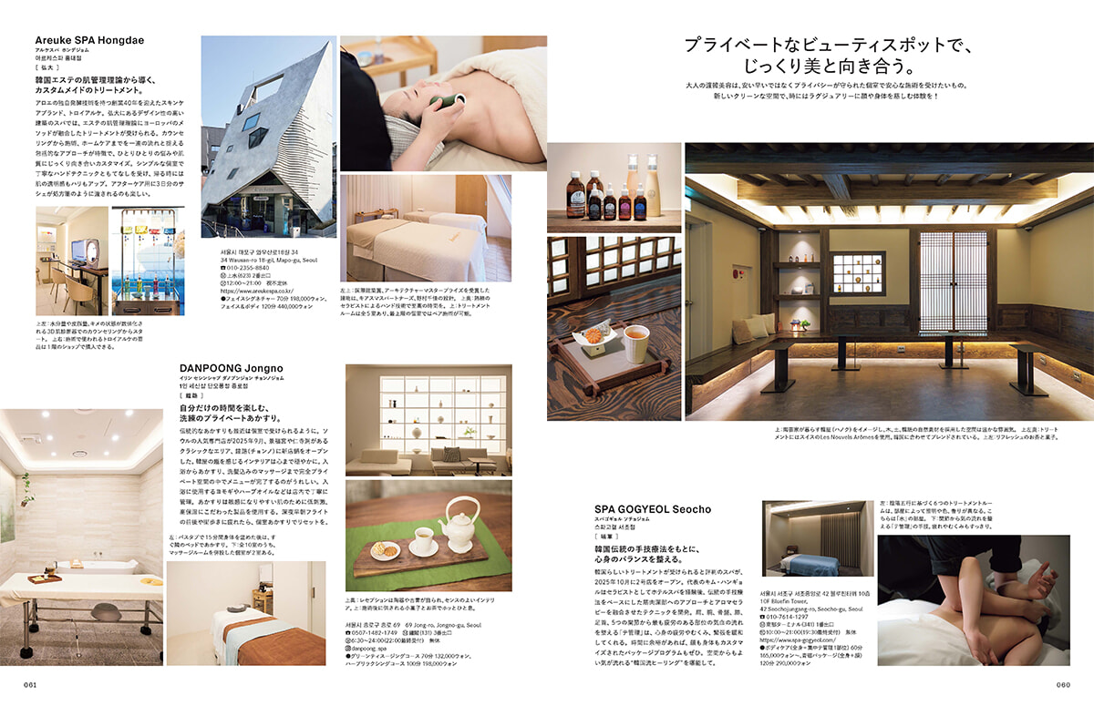 大人だからって体力がないワケじゃない。ユースカルチャーやY2Kファッションに背を向けているつもりでもない。B級グルメだっておいしいし、たっくさんコスメを買い込んで、いろいろ試したい気分もまだある。けれど、何度も行っている韓国だからこそ、ゆったりと、しっとりと寛げる旅行をしてみたい。そんな読者の方々を想定して作ったのが今号です。