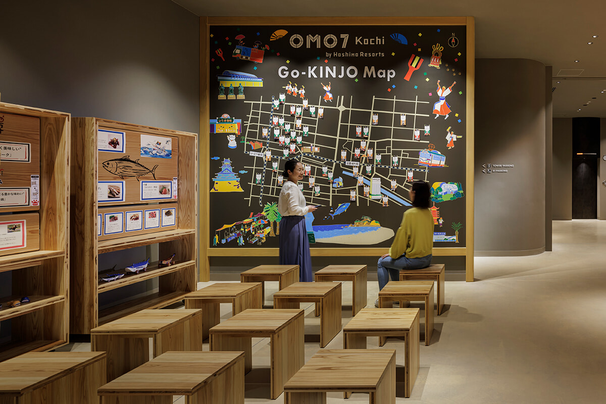 ホテルは高知市でも2番目に高いという22階建てです。全客室数は8タイプ、133室が揃います。愛犬と泊まれる部屋(ドッグフレンドリークィーンルーム)も3室造られました。そして他の「OMO」同様に、ここ高知にも1階には滞在の拠点として誰もが集える「OMOベース」があります。高知市のイラストマップが飾られ、夜の「よさこい楽宴 LIVE」の舞台となる広いスペースと、その前には観客席となる大階段があり、さらにライブラリーやカジュアルなOMOカフェ&バルも営業。吹き抜けで開放感のあるスペースが私たちを迎え入れるフロントエリアです。