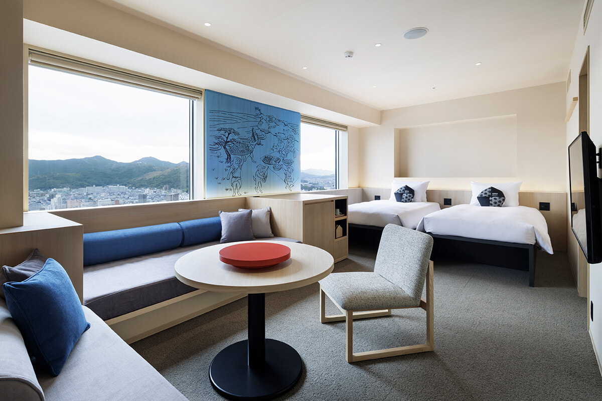 133室揃う客室のうちの”うたげスイート”(38㎡)は4名まで利用可能。壁の一部に飾られているのは人に扮した土佐犬がもてなし、もてなされる高知文化の日常の様子が描かれた色違いの絵が室内を盛り上げる。