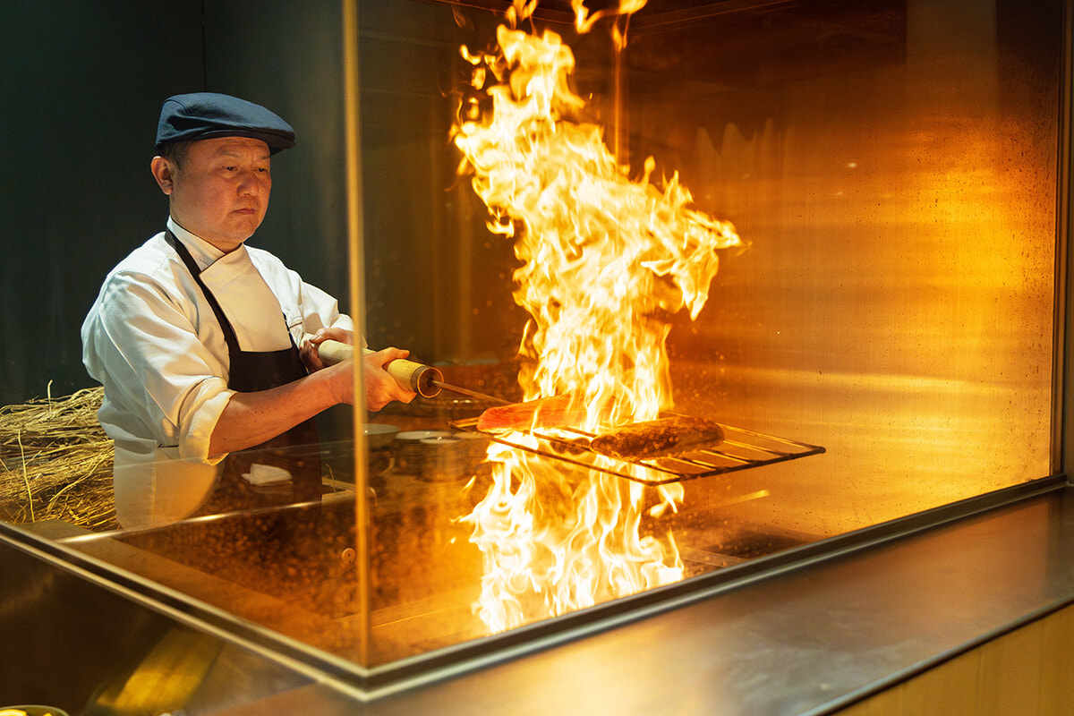 「OMO7高知」の食事はビュッフェスタイル。そこで提供される人気の食材は鰹とビーフ。両方ともに香ばしい藁焼きで仕上げられる。