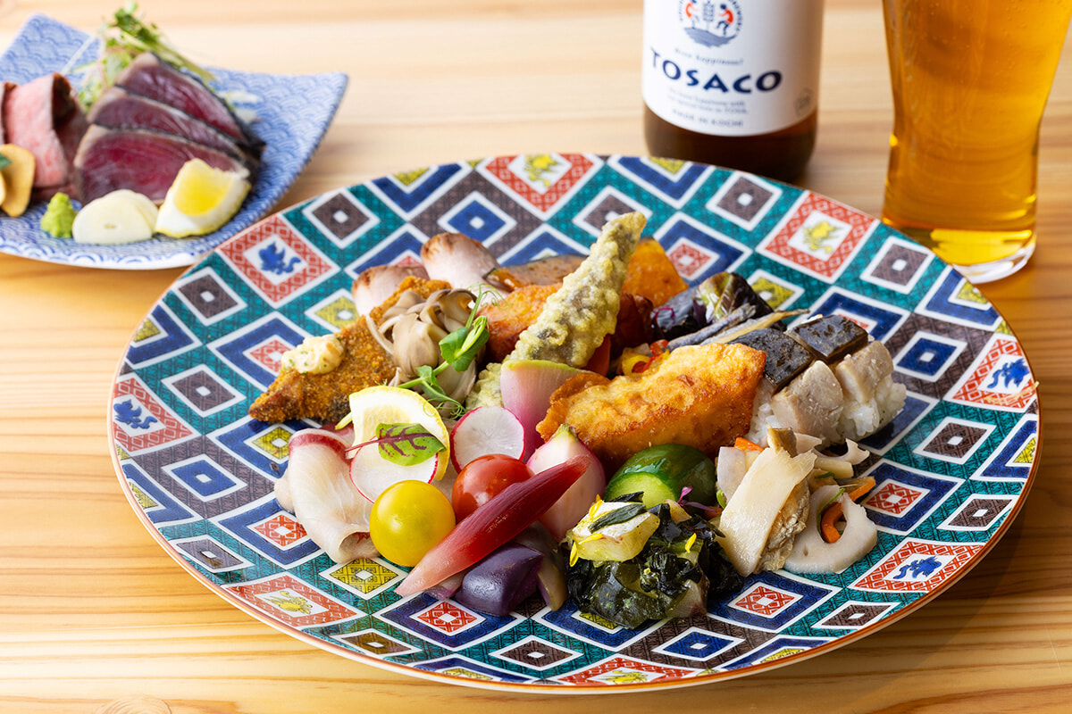 高知の宴会料理である「皿鉢(さわち)」に着想を得た大皿に、高知のうまいもんを好きなだけ盛り付け、皆でワイワイと食べる。デザートには土佐名物”芋ケンピ”も並ぶ。