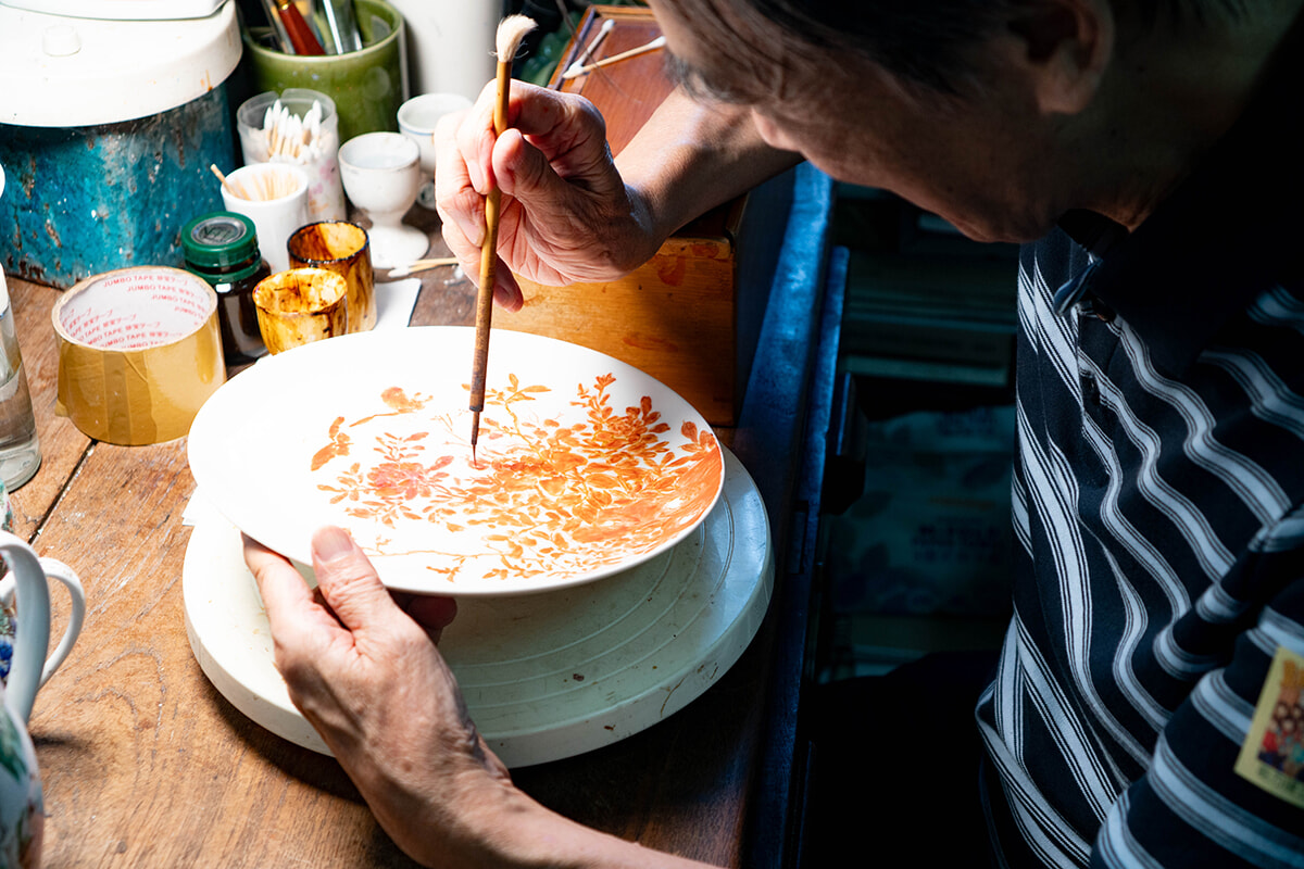 ここでは、日本や中国から仕入れた白無地の陶磁器に、主に「広彩(ゴンチョイ)」と呼ばれる、中国の広東省や香港に長年伝わるカラフルで華やかな絵付けを施している。熟練の職人による手描きの一点ものを中心にしたさまざまな柄が並んでいて、お皿ひとつとっても、サイズや形状も多種多様。