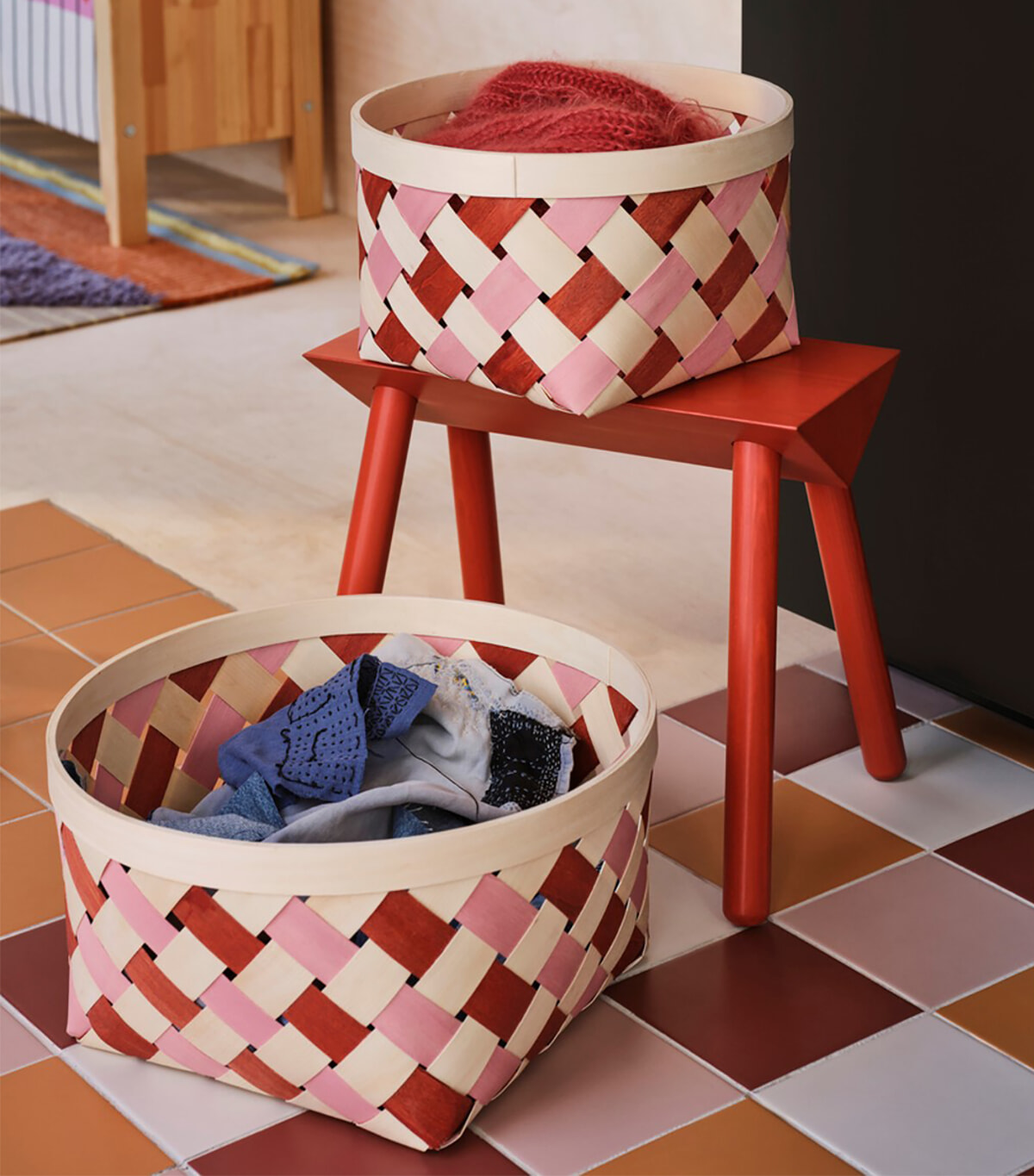 薄く削いだポプラ材で編んだハンドメイドのカラフルなバスケット。天然素材は使い込むほどに独自の色や風合いが増すので、使っていくうちに異なる、新たな表情が生まれる。「OMMJÄNGE/オッミェンゲ バスケット2点セット」¥2,999