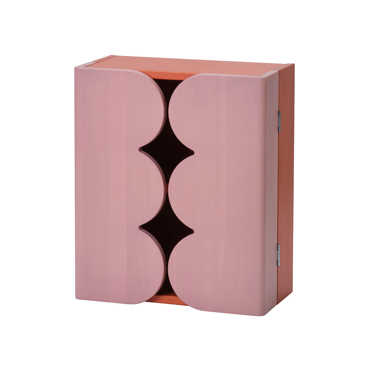 グラフィカルな見た目が特徴のキャビネットは、装飾的な小型のリカーキャビネットがあったことにインスパイアされ、まるでアート作品のよう。目を引くピンクの扉と木製のフレームは暮らしに溶け込みつつも、部屋にポップな色彩をプラスしてくれる。