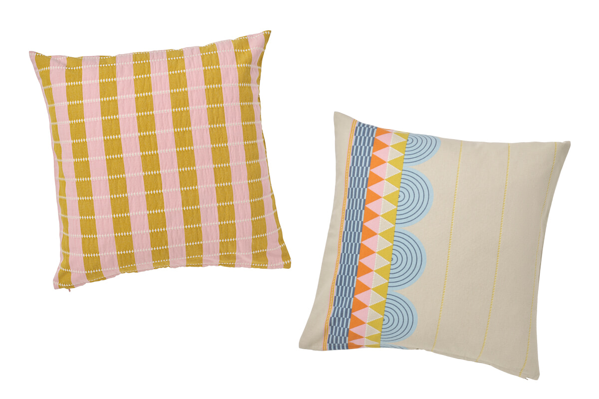 異なる色のストライプが魅力的な模様はドビー織りによるもの(写真左)で、立体的な独特の風合いとナチュラルなシワが特徴のクッションカバー。穏やかなトーンや色使いの楽しい模様で、柔らかな使い心地のカバーは、シンプルな部屋のアクセントにも。