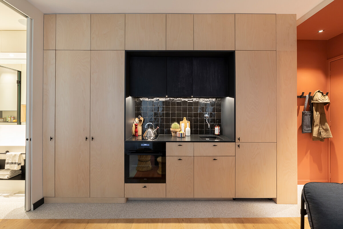 「リビングに組み込まれたこのキッチンは、壁一面を占めています。実用的でありながら、堂々と見せられる場所です。収納のデザインがこのキッチンの要でした。キャビネット本体はすべてイケアのものですが、扉は特注で、明るい白樺の合板を使用しています。これは、意図的に黒いゼリージュの調理台とキッチンパネルとコントラストをなしています。これらの収納は、隣室との間の壁の遮音性を高める役割も果たしています。生活空間をできる限り広く保つため、すべてが徹底的に最適化されました。これは一種のスタイル演習でもあります。ボンヌマズーカンビュスの美しいドアハンドルや、スウェーデンブランドのBBスウェーデン・ハードウェアの取っ手といった、細部への配慮が空間の印象を大きく変えます。品質には一切妥協していません。」