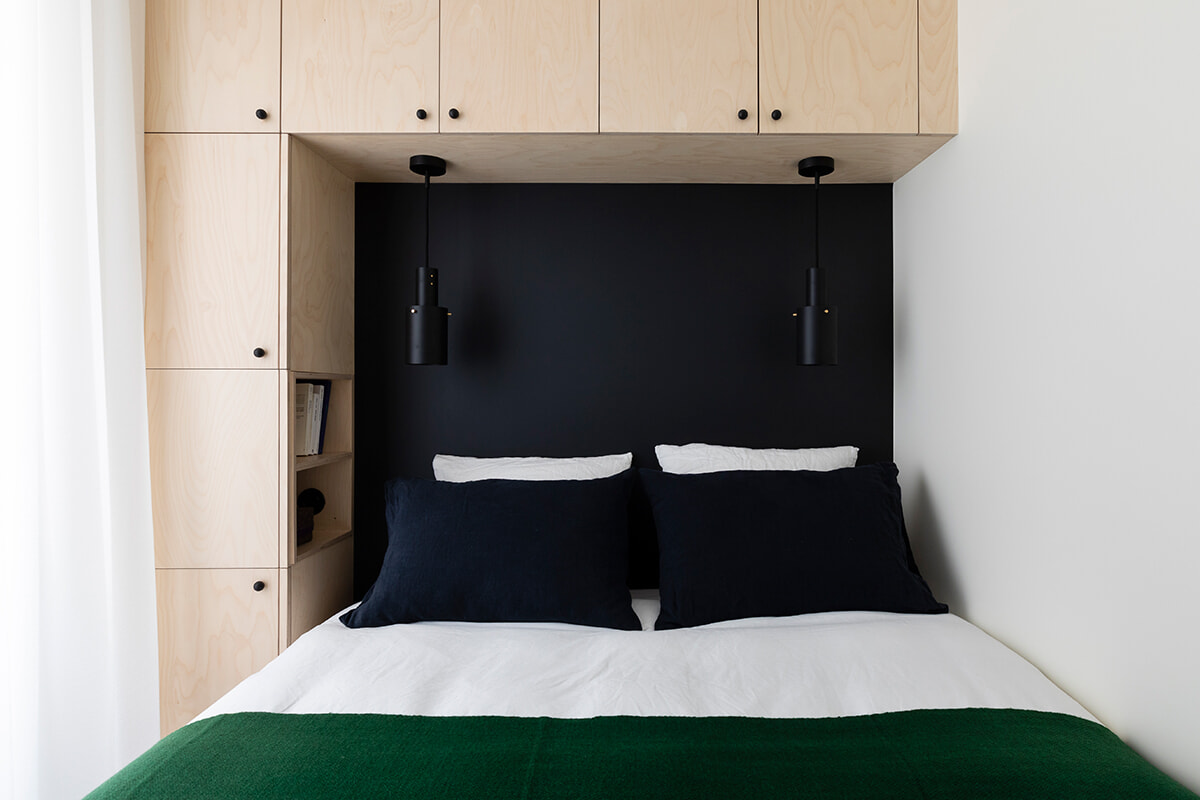「寝室の黒いアルコーブは、キッチン空間と呼応するよう、同じ素材と色を用いて設計されています。床から天井まで収納が設けられ、ベッドの下にも収納ボックスがあります。それでも、丁寧な仕上げによってそれらの機能を目立たせない工夫を施しました。これが大きな違いを生みます。明るい壁には、THPGの黒いベークライトのスイッチを取り付け、白と黒の装飾的な文法の延長になっています。寝室には内側のカーテンを設け、リビングから切り離すことで温かみを加えました。空間を有効活用するため、バスルームへの扉は引き戸になっています。」