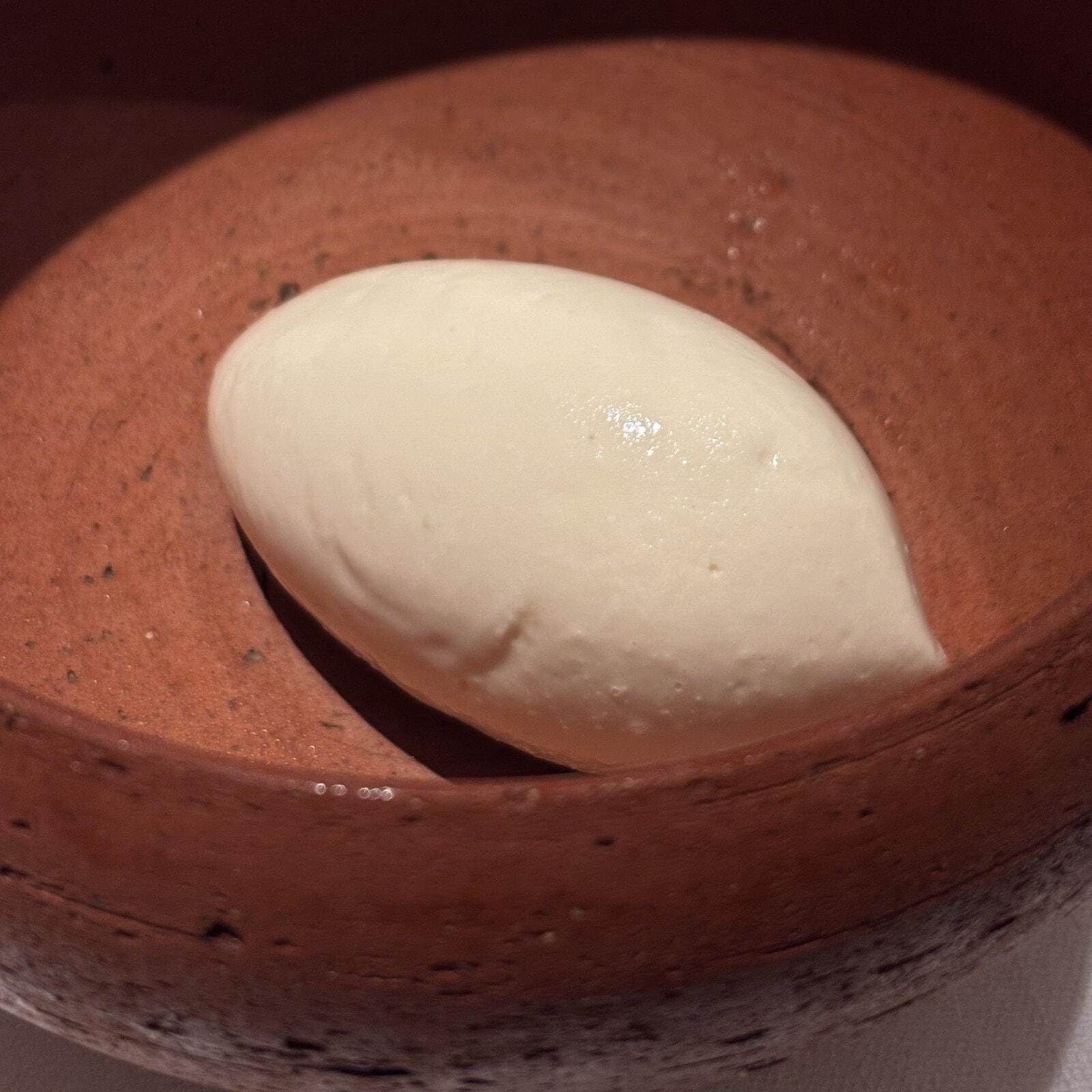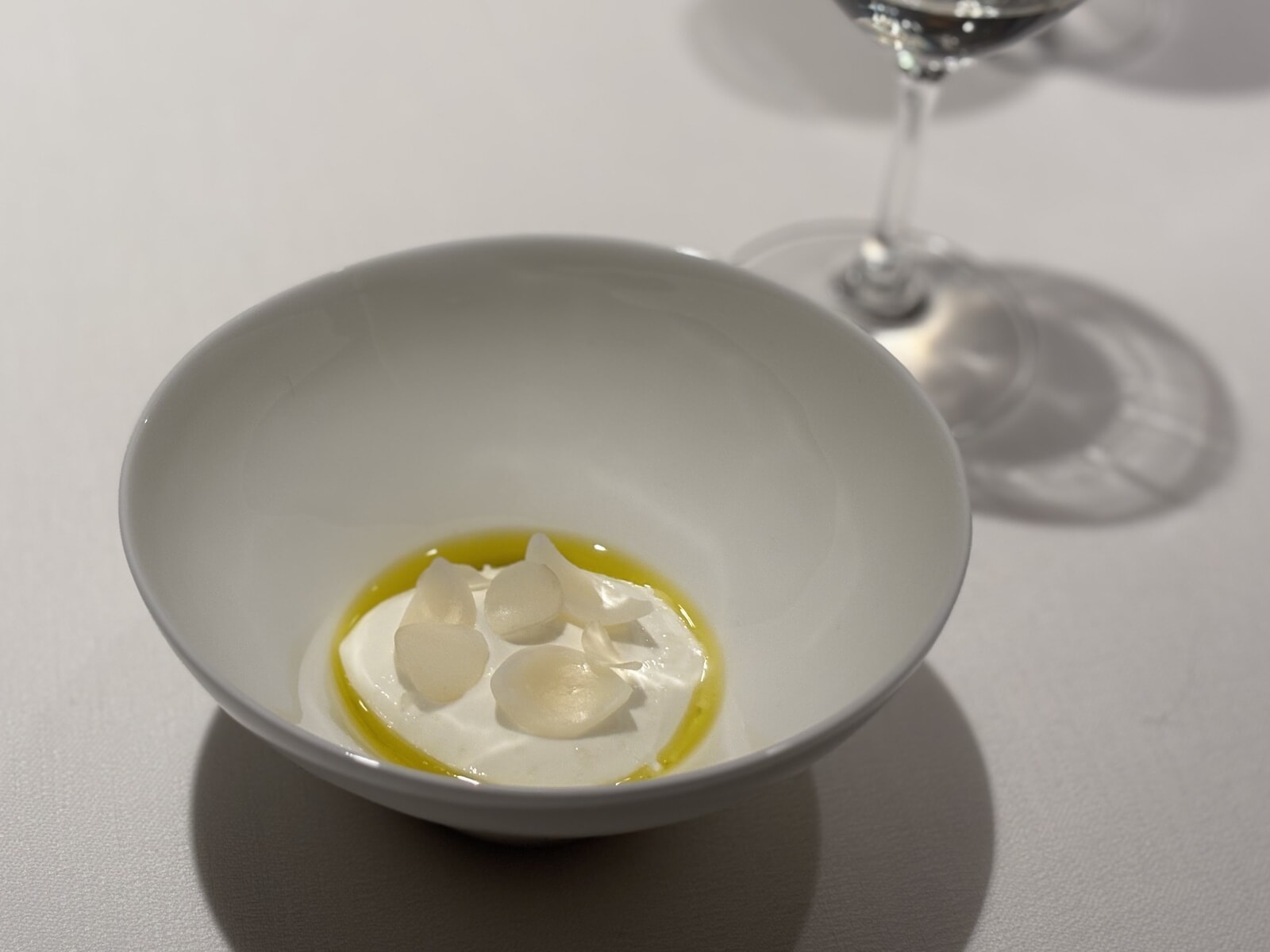 このワインが呼び込む料理が「山羊のミルクのバヴァロワ」。あっさりとしていながらも、どこかに粒感を感じるようなまろやかさをもつバヴァロワに、オリーブオイルの爽やかな苦味が寄り添う。冬の滋味である百合根がほぐれる食感は、ワインに感じた土のニュアンスにぴたりと寄り添う。温度の低い時には立ち現れなかっただろうワインの特徴が、食事の味わいひとつ一つに豊かに絡まっていく感覚を味わえる。