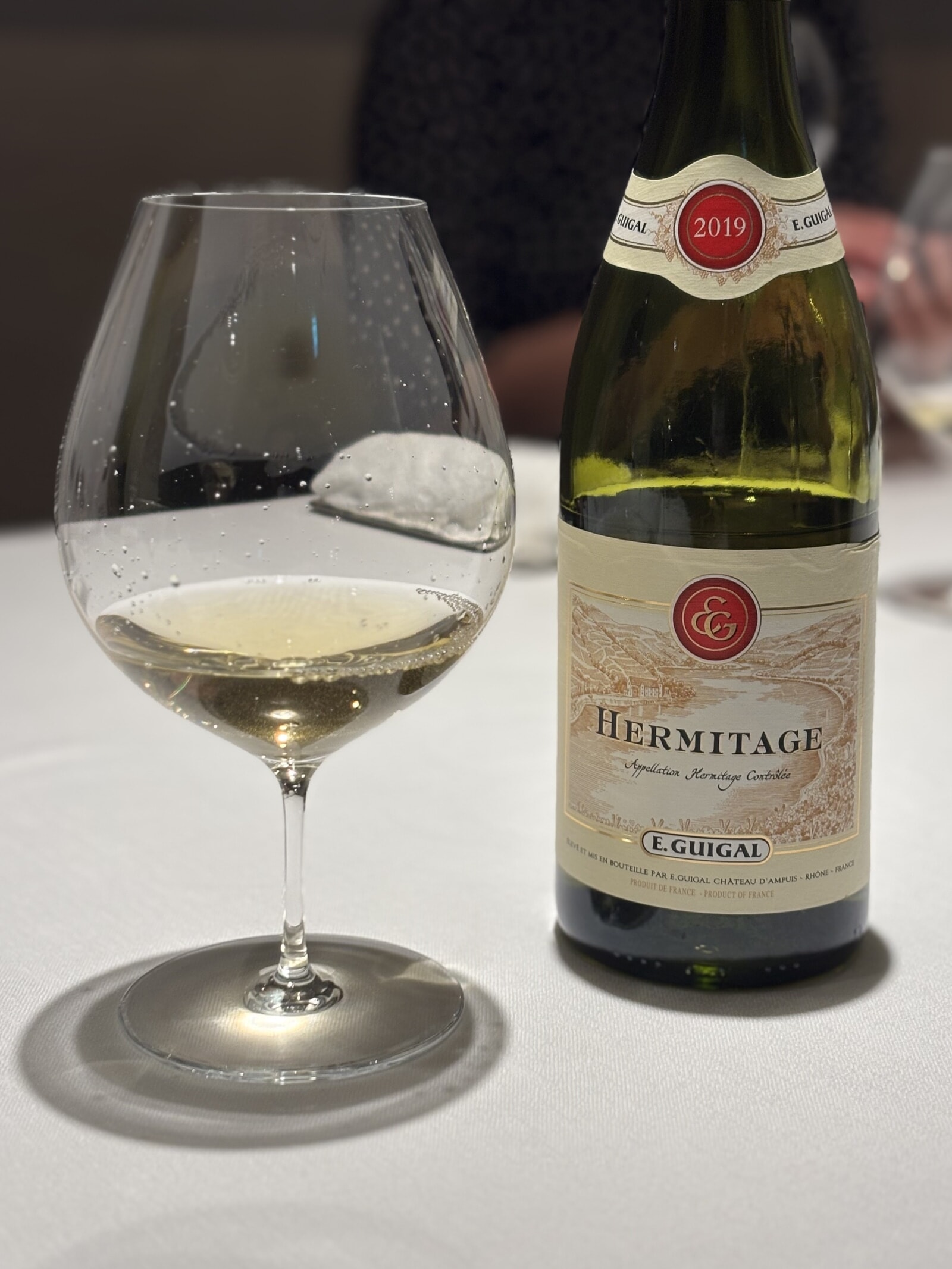 白ワインのグラスがさらに続いていくことに、ちょっと驚きつつワクワクは止まらない。続いて提供されたのはフランス、ローヌ渓谷北部の盟主たるE.ギガルのエルミタージュ・ブラン 2019。こちらも温度は12度くらいだろうか、白ワインにしては少々高めの温度だ。