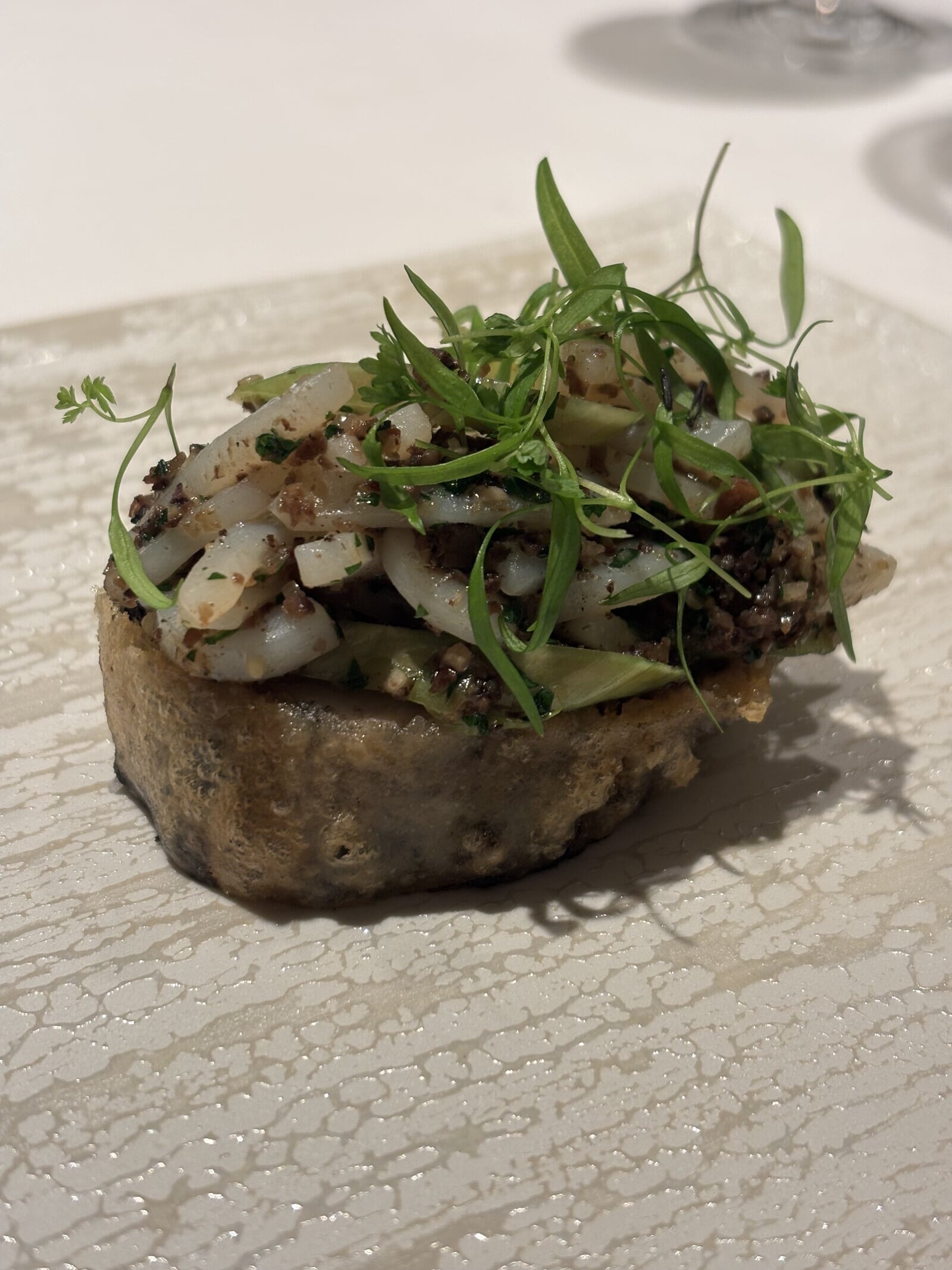 表面をカリッと揚げ、中身はホクホクの海老芋の食感のおもしろさに、イカの歯ごたえと甘み、プンタレッラ(チコリーの一種)のほろ苦さとハーブ、スパイスが寄り添う。 膨らみのある料理のボリューム感に、しっかりとした白ワインのボディ感が伴奏していく心地よさ。その余韻に浸っていると、さらに驚くべきペアリングが提供された。南仏、ルーション地方で造られる酒精強化ワイン、リヴザルトだ。