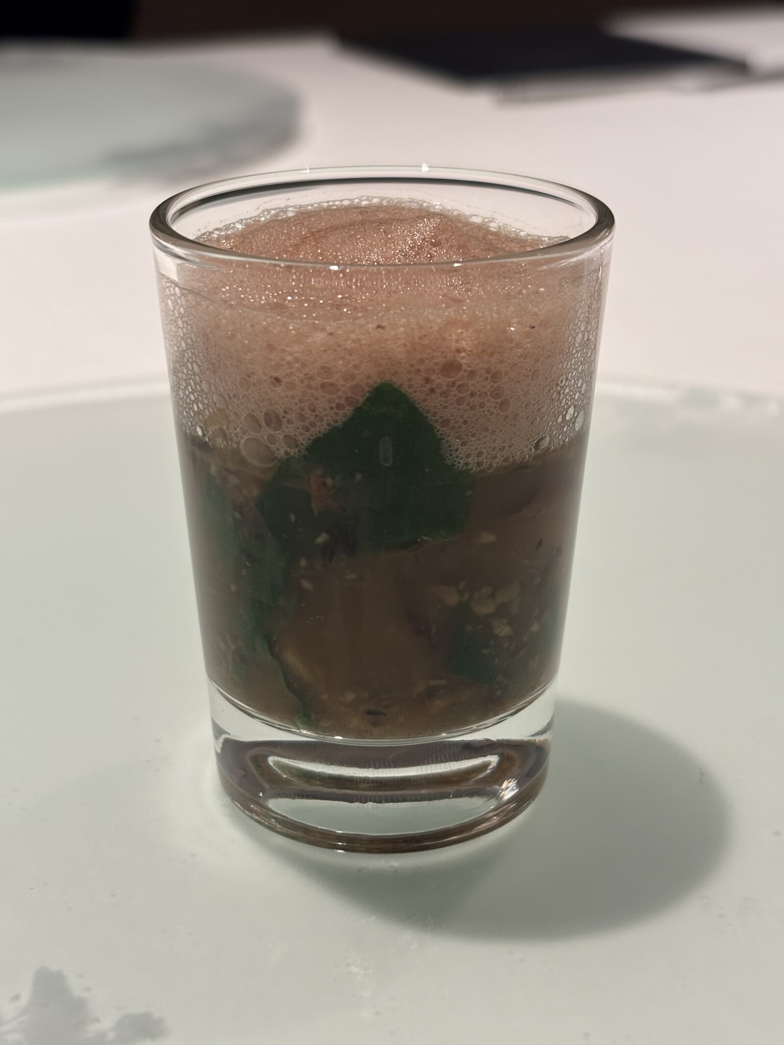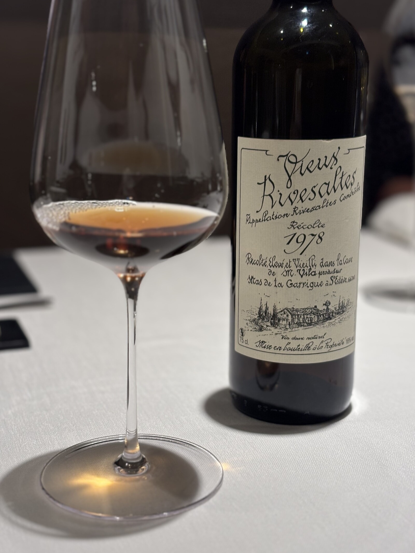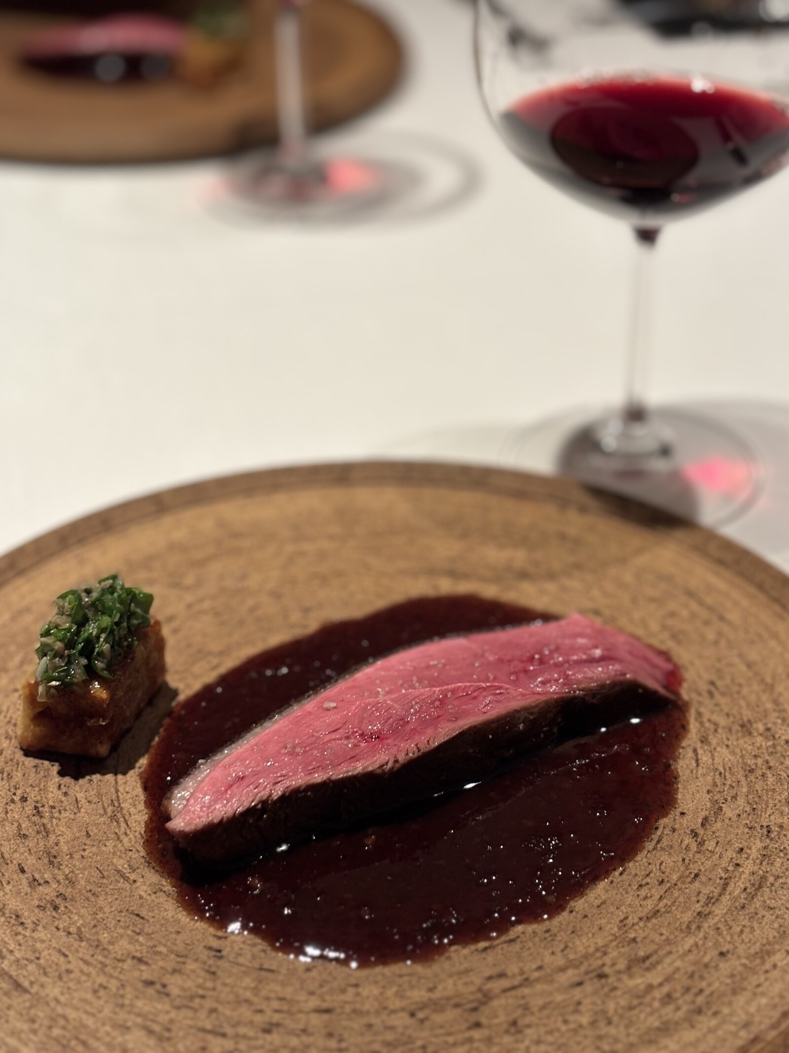 リヴザルトはヴァン・ドゥ・ナチュレルと呼ばれる、ワインの醸造中にブランデーを加えて発酵を止め、ブドウの持つ甘みが際立つドリンク。今回提供されたのは1978年ヴィンテージ、47年ほどの熟成を経た古酒だ。アプリコットやアールグレイのような紅茶のニュアンスに、豊かな甘みが寄り添う。これまでリヴザルトを食後酒として楽しんだことはあったが、食中酒として飲んだのは初めてだった。グラスの奥にコーヒーやカカオのニュアンスを感じ取った時、運ばれてきた料理に納得した。