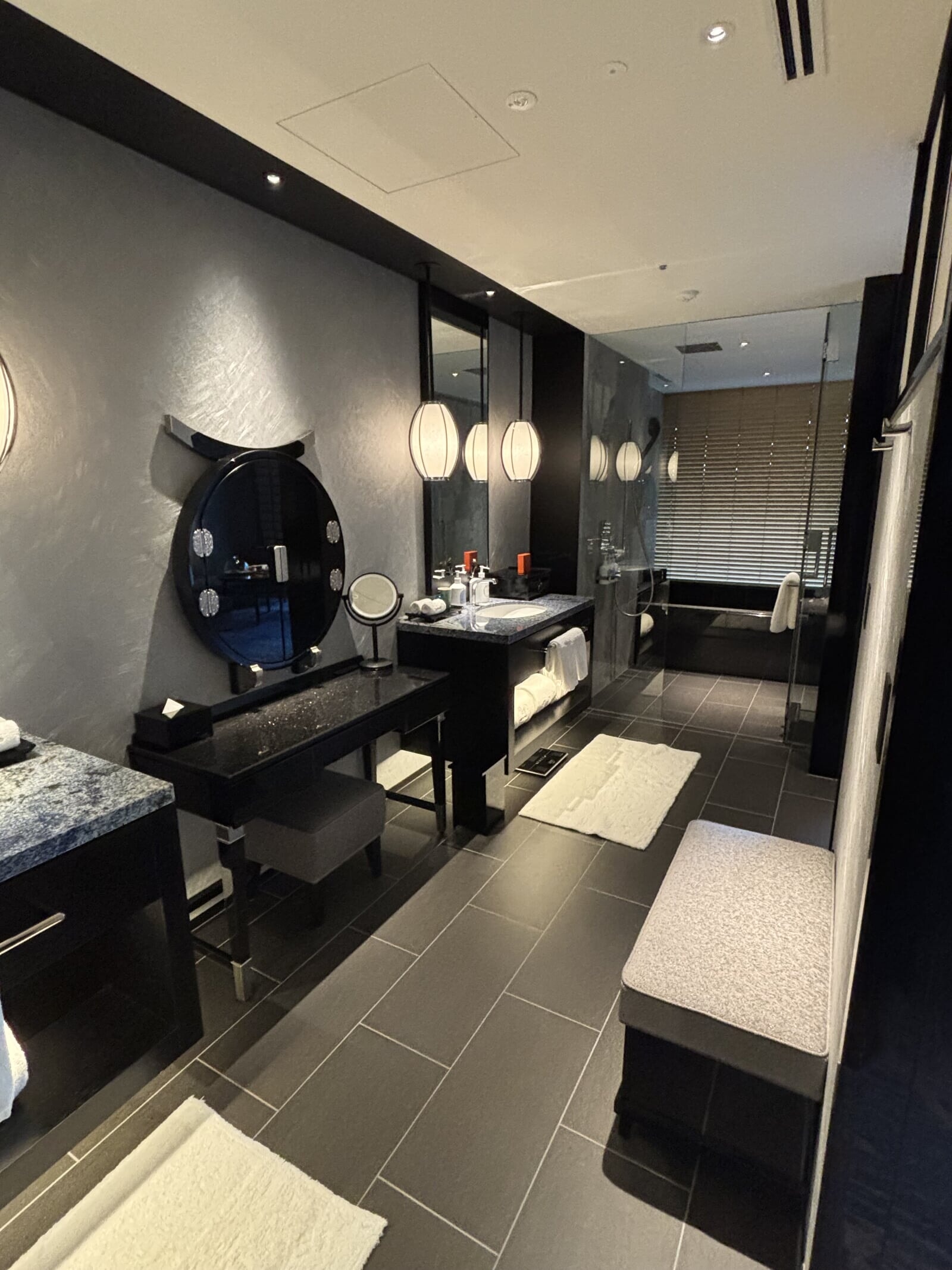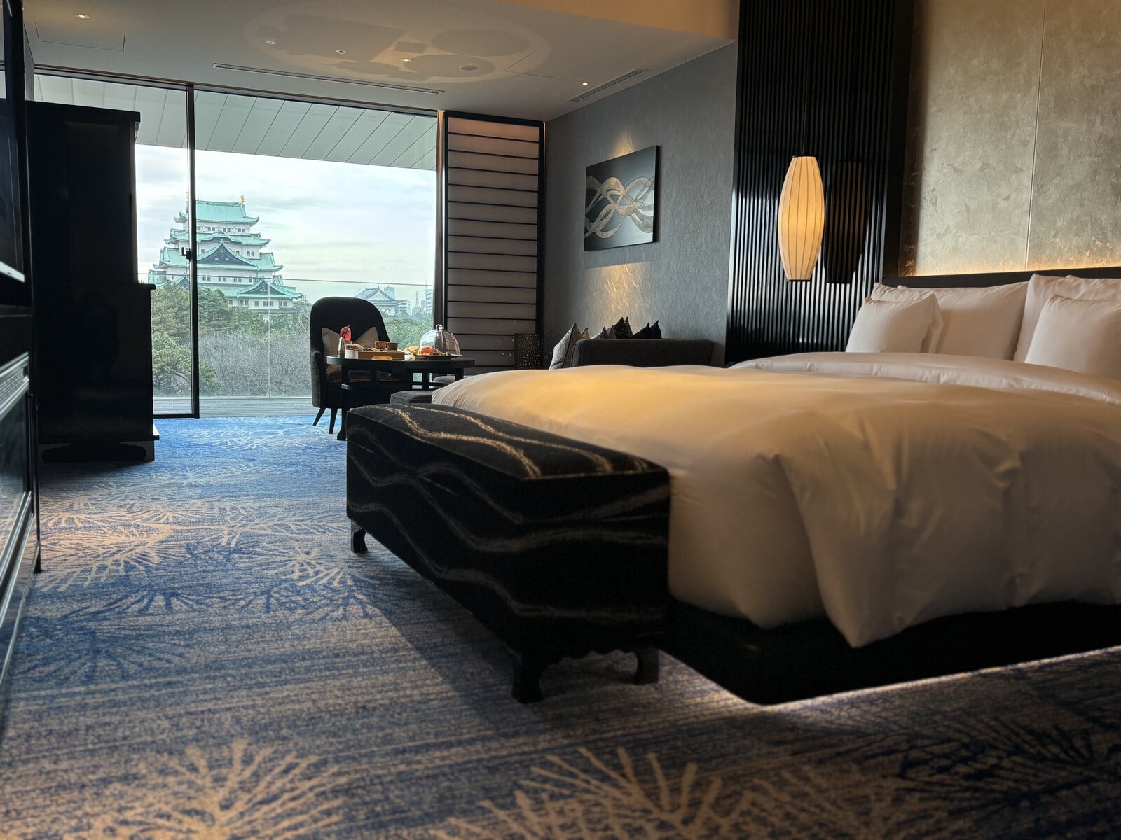 この日宿泊したのは、ベッドの上の金色の襖と紺色を基調とした重厚感ある部屋造りのラグジュアリールーム。全室にバルコニーが備わり、城側に向いた部屋であればベッドの上からでも、バルコニーからでも、また浴室からでも名古屋城の息吹を感じることができる。