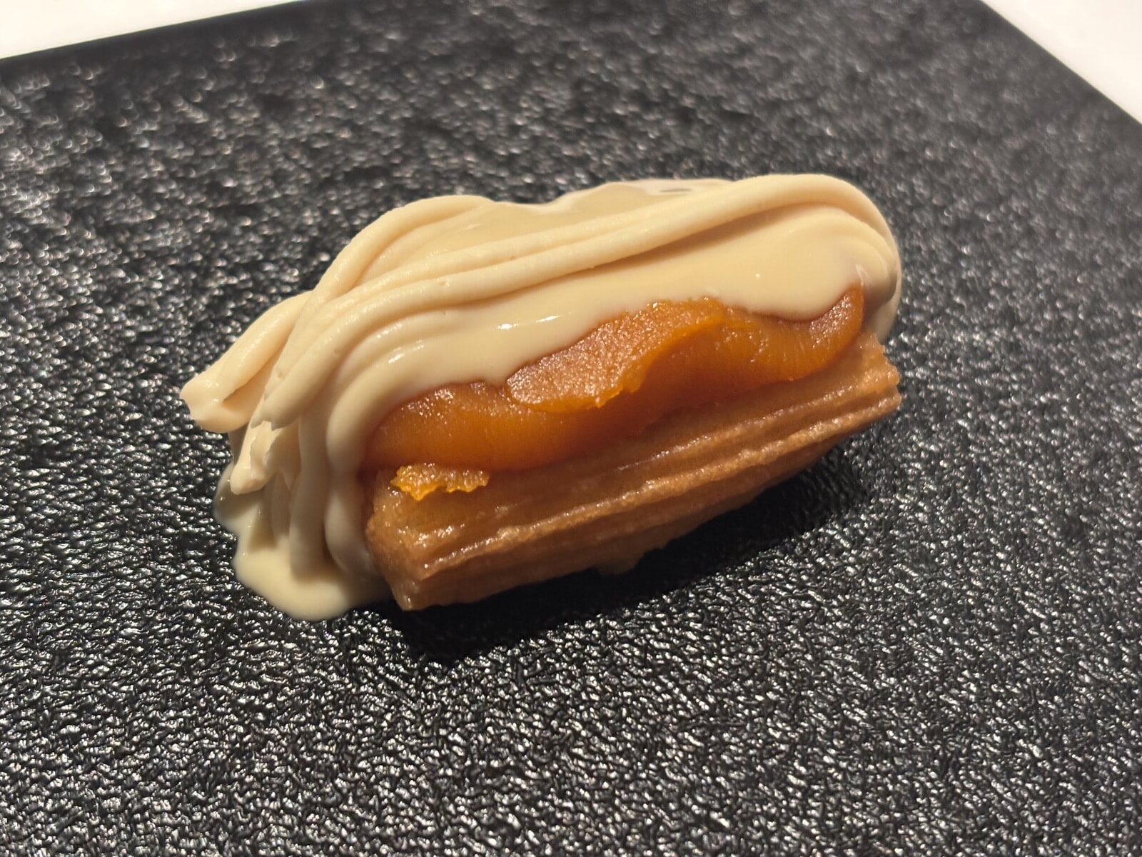 チュロス生地、ペースト、ソースにカボチャをふんだんに使用したデザートは、カボチャ本来の甘みも引き立つ、温度感の違いも楽しいひと皿。