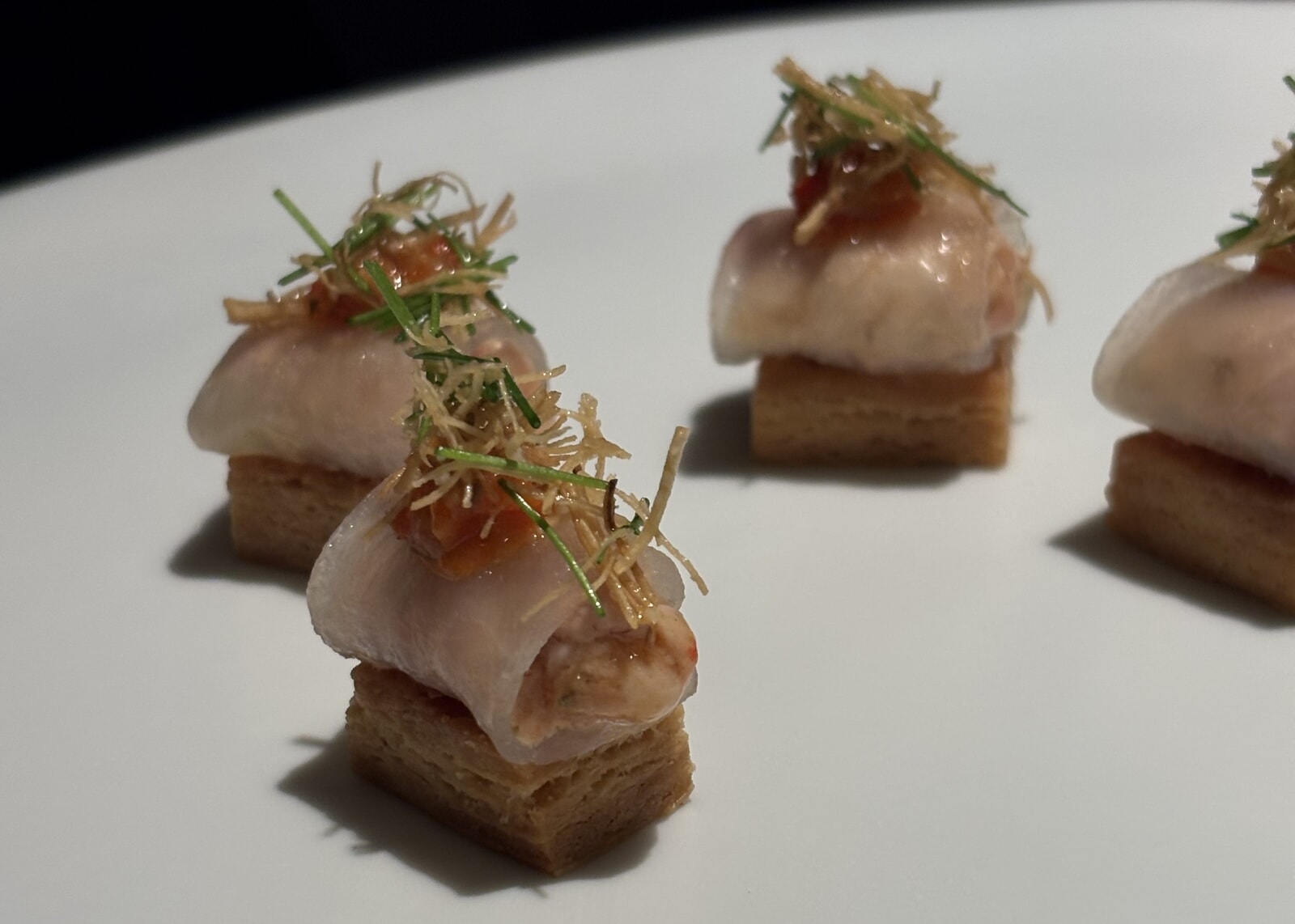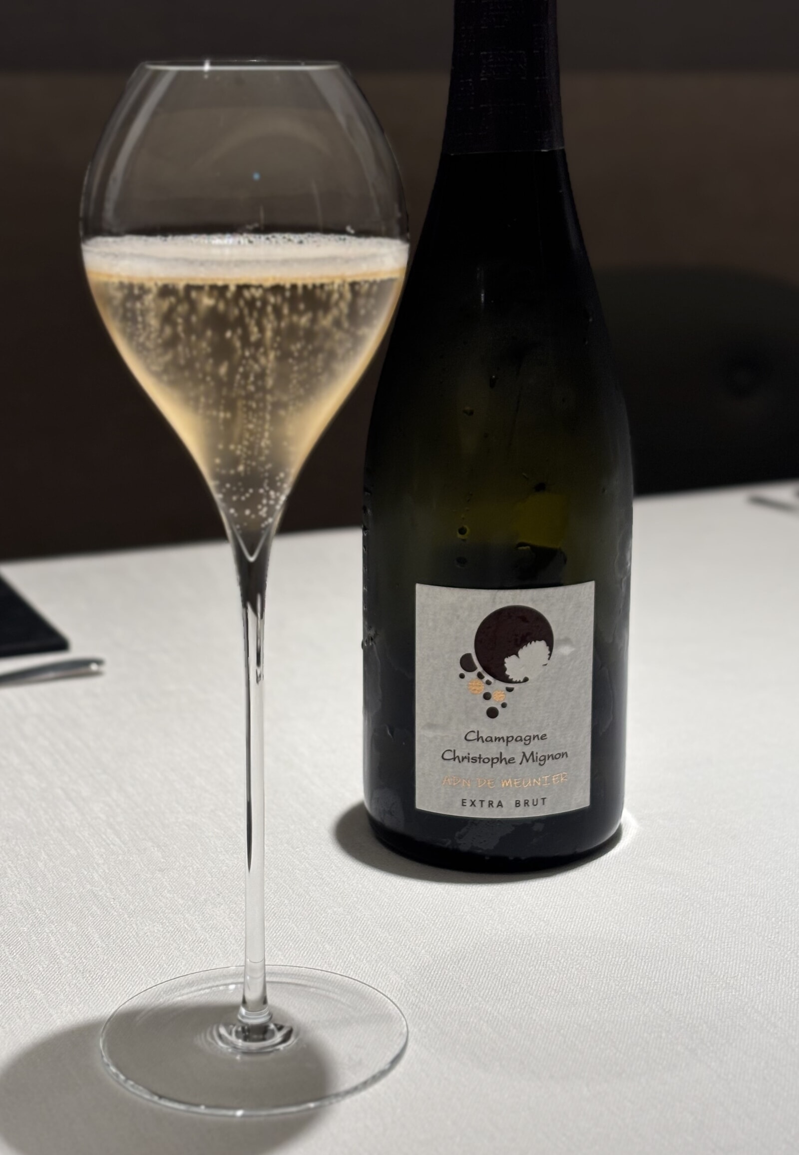 乾杯で注がれたのは、クリストフ・ミニョンによるシャンパーニュ。補助的に使われることの多かったムニエという品種に脚光を当て、ビオディナミ製法で丁寧に味わいを引き出す生産者だ。ピンクゴールドのようにも感じる液面には、美しく微細な泡が立ち上る。まろやかな味わいの中に青リンゴや若い洋梨の豊かな香りを感じ、しっかりとした酸とミネラル感が口を引き締めてくれる。併せて供されたのは「カワハギ 完熟万願寺 サブレ」だ。