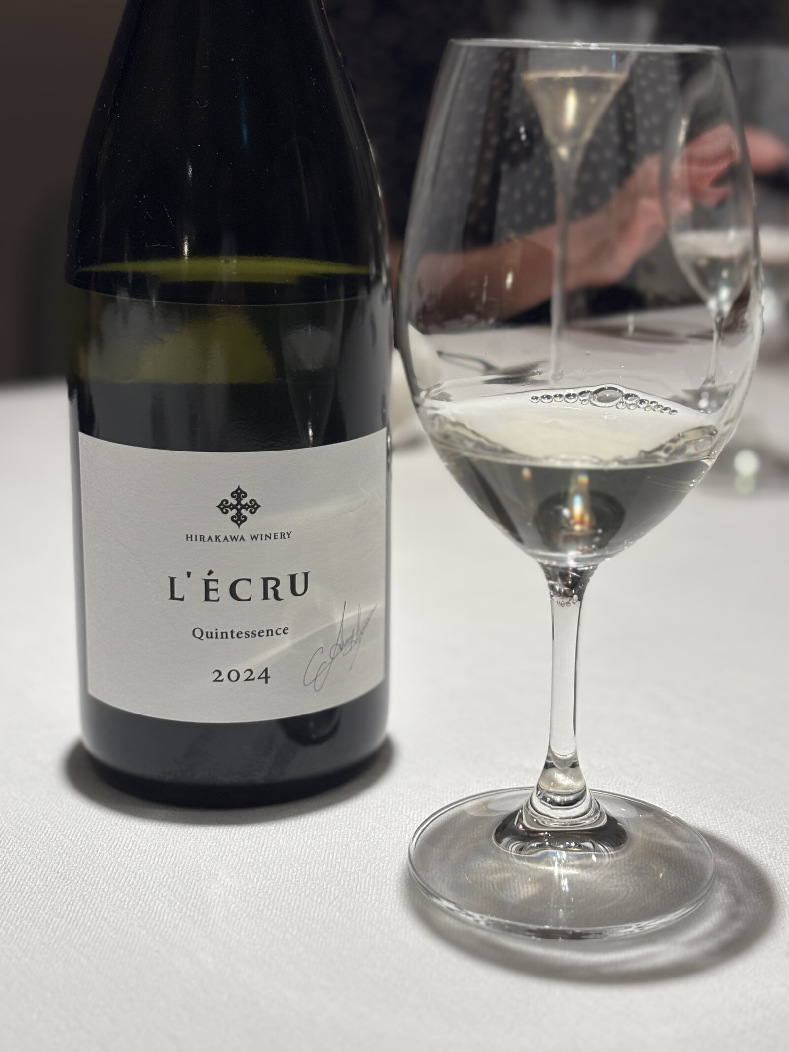 次の料理に備えグラスに注がれたのは、北海道余市・平川ワイナリーによる「レ・クリュ」というワイン。これをほぼ室温の状態で大ぶりのグラスで提供したことに、かなり驚いてしまった。