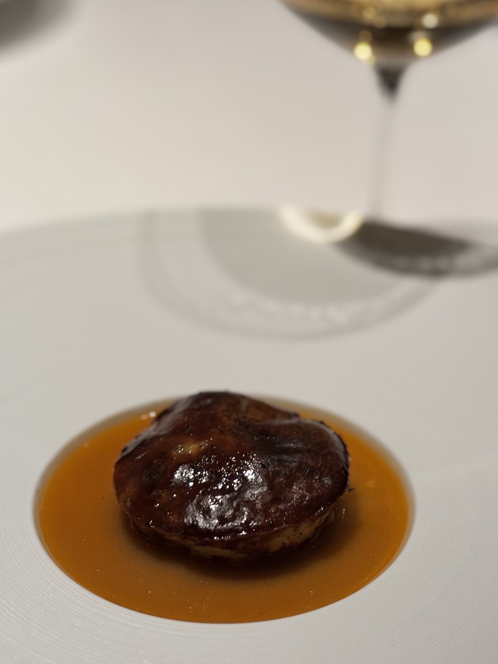 カカオニブを薄く成形したサクサクのシートに、極上の滑らかさを持つフォアグラと焼きナスが層を織りなす。岸田シェフ、そして髙瀬シェフが心から大事にする「プロデュイ(素材)」「キュイソン(火入れ)」「アセゾネ(味付け)」の三要素が、ひと皿の上に結実する。食感の妙と香り、味わいが口いっぱいに広がり、リヴザルトの味わいが余韻をさらに引き延ばしていく……。