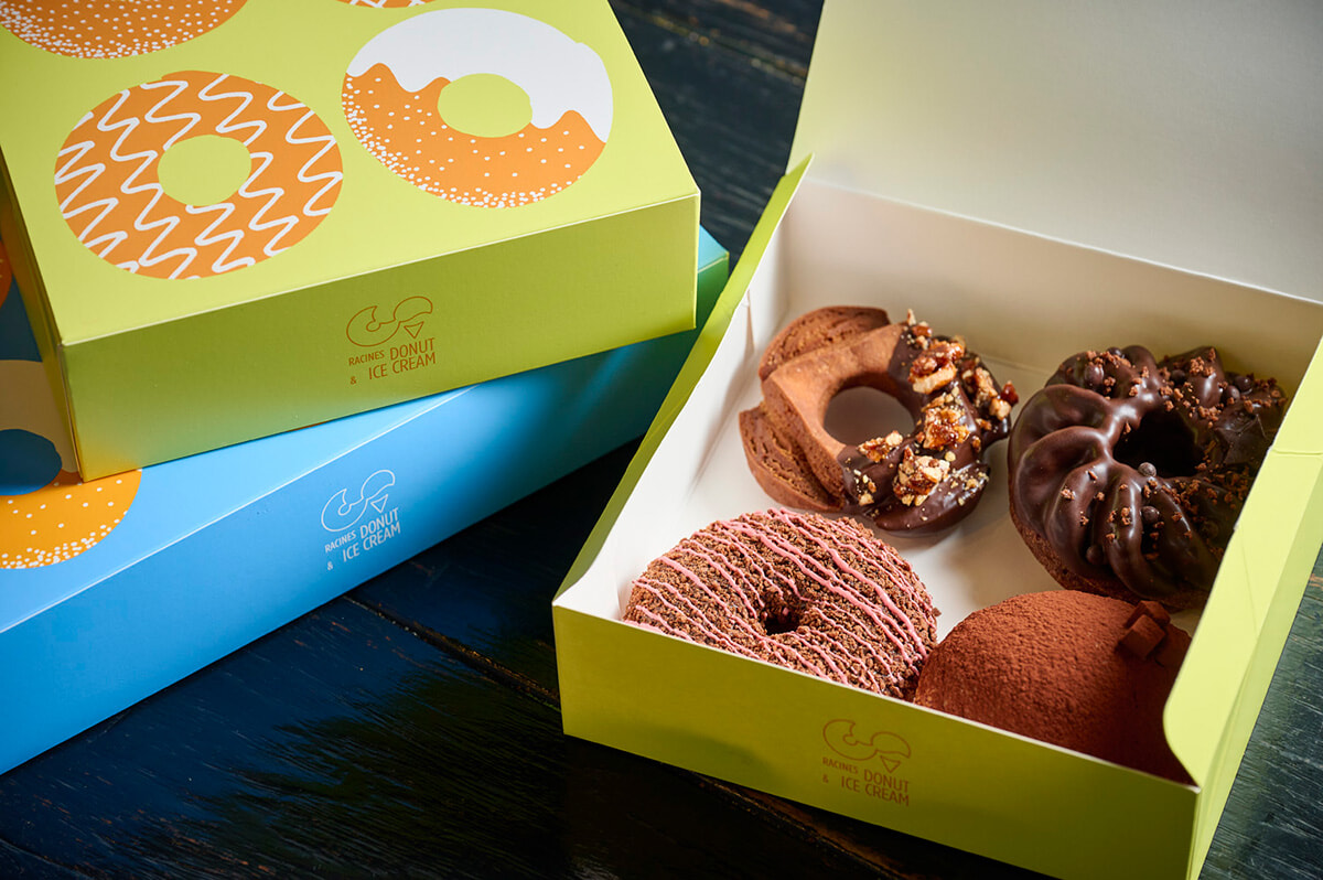生地にこだわり抜いたドーナツ作りが評判を呼び、行列の絶えない人気店となったRACINES DONUT & ICE CREAM(ラシーヌ ドーナツ & アイスクリーム)が、今年もバレンタイン限定のドーナツを発売。イーストを使わずにふんわり焼き上げた軽い食感のフレンチクルーラー、しっとりふわふわのブリオッシュ2種、米粉を使ってサクサク食感に仕上げたオールドファッションを、それぞれ香り高いチョコレートをたっぷり使ってアレンジ。いずれもカカオの味わいの濃淡やナッツの香ばしさの相乗効果でおいしさが引き出されているのがポイントだ。甘さだけでなく、ほろ苦さや食感も楽しめる大人にぴったりのドーナツだから差し入れにも喜ばれるはず。
