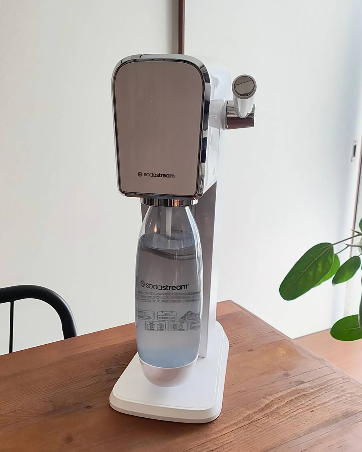 初代ソーダストリームは電動だったのですが、今回選んだモデルは手動レバーで炭酸ガスの注入量を調整できる「アート」。丸みのあるレトロなデザインはミッドセンチュリー感を醸し出し、築50年の我が家にもなじんでいます。