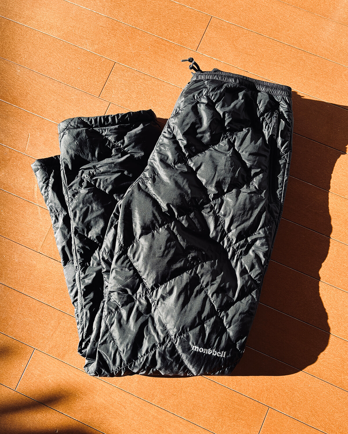 そこで購入したのが、モンベルのダウンパンツ。ボトムの下にタイツを履くとどうもウエストまわりがもたついてあまり好きではない。でも、このダウンパンツなら風をあまり通さないので、1枚だけでもかなり暖かい。軽量のシェル素材とダウンのコンビでとにかく軽いのも魅力。くるくる巻けばコンパクトに収納もできるので、旅にももってこいです。
