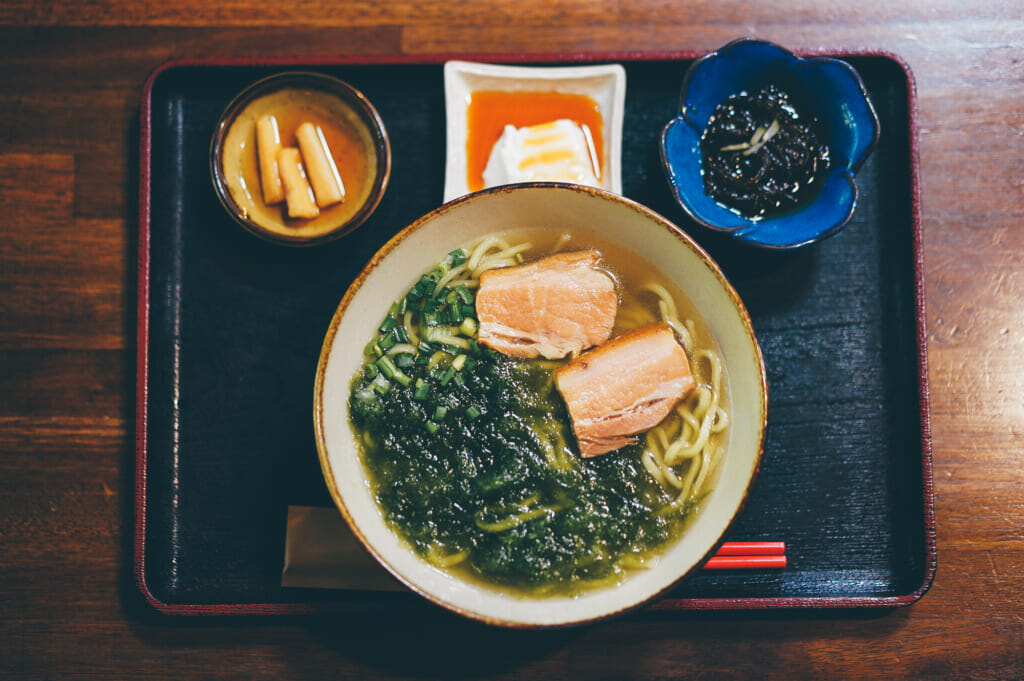 アーサを練りこんだ麺に三枚肉とアーサがトッピング。(1,290円)