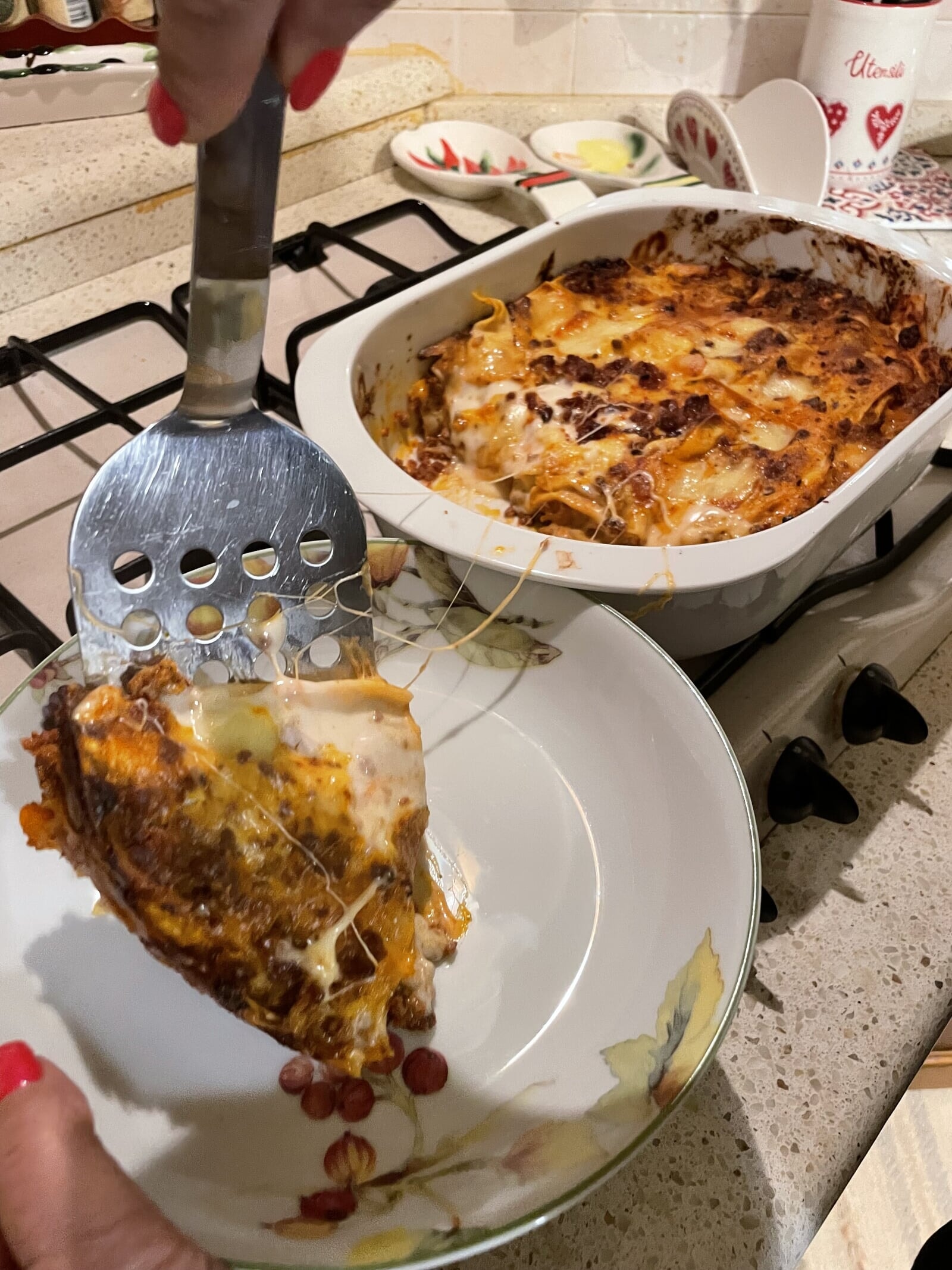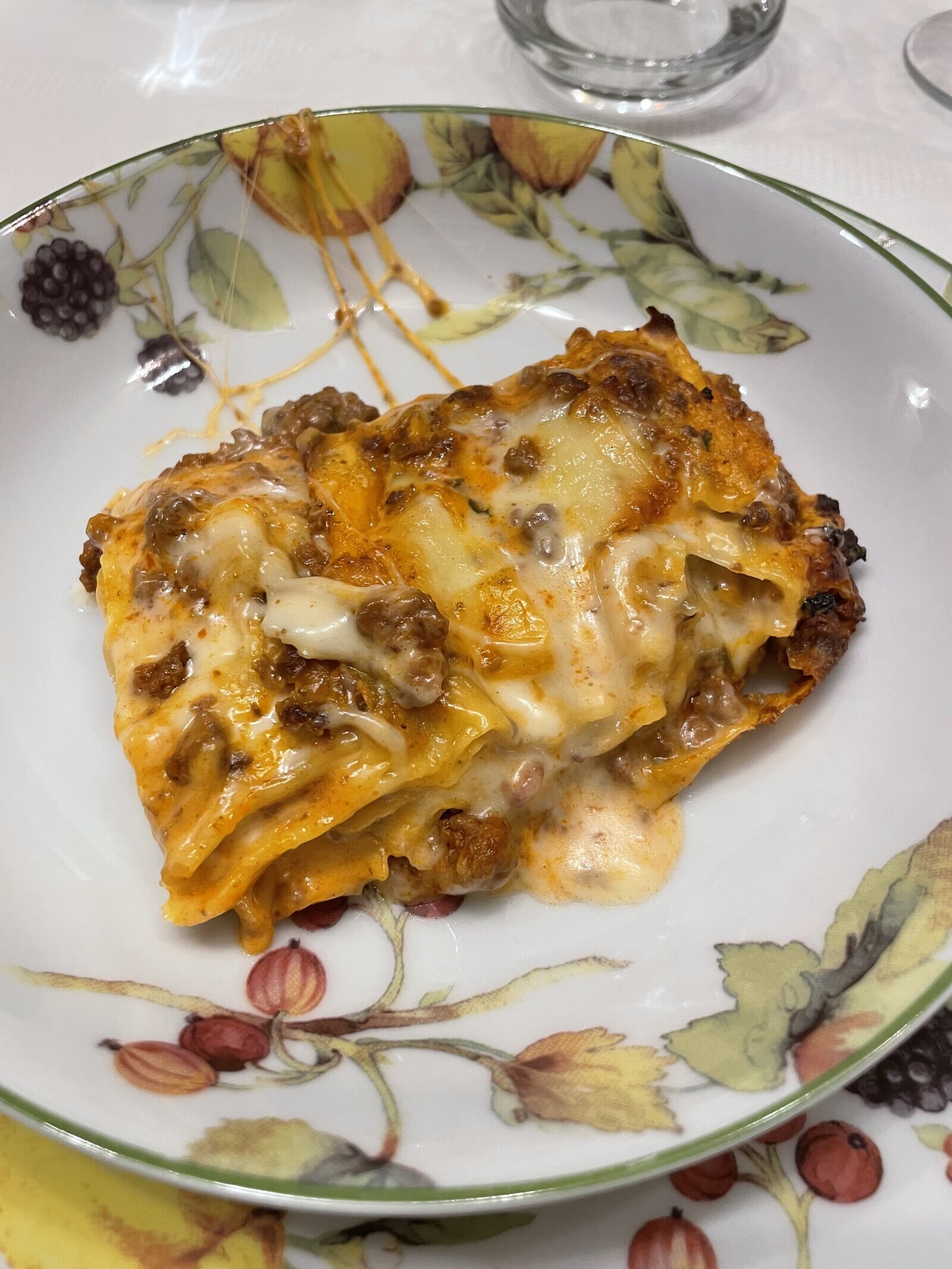 熱々のラザニアを皿に取り分ける。フォンティーナチーズが長い糸を引く。フォークを入れると、幾重にも重なった層がほろりと崩れ、湯気が立ち上る。ひと口食べると驚くほど濃厚だ。でも、優しい。肉の旨味やトマトの酸味、ベシャメルのクリーミーさ、そしてフォンティーナの芳醇なコク。すべてが口の中で一体となって、喉を通った瞬間に身体の芯まで温かさが広がる。心から、「おいしい……」と声が出るだろう。