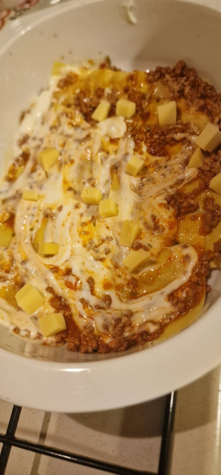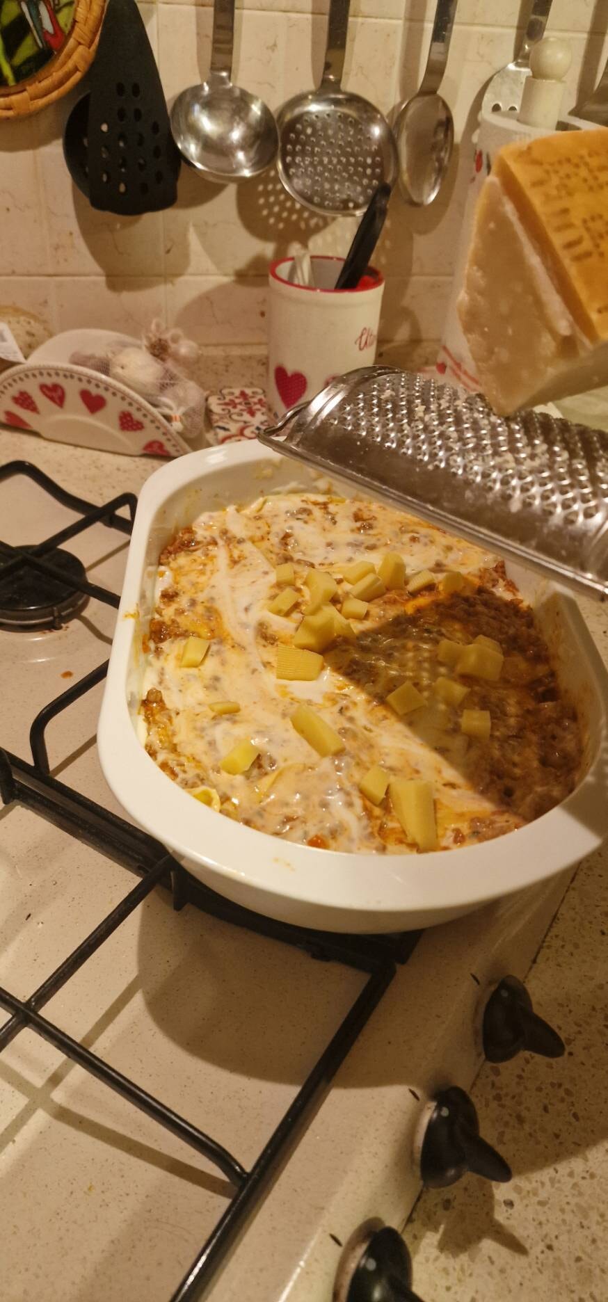 この②〜⑥の工程を、皿の深さが許す限り繰り返す(通常は3〜4層)。最後のいちばん上の層は、パスタが隠れるようにソースとチーズで覆い尽くすこと。