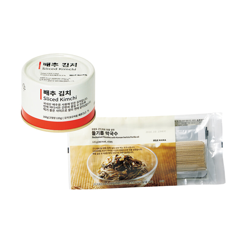 手軽に楽しめるよう食べやすいサイズにカットして缶詰めにした白菜キムチと、人気のエゴマ油マッグクスが自宅で簡単に作れるミールキット。韓国の無印良品でしか買えない2品。
