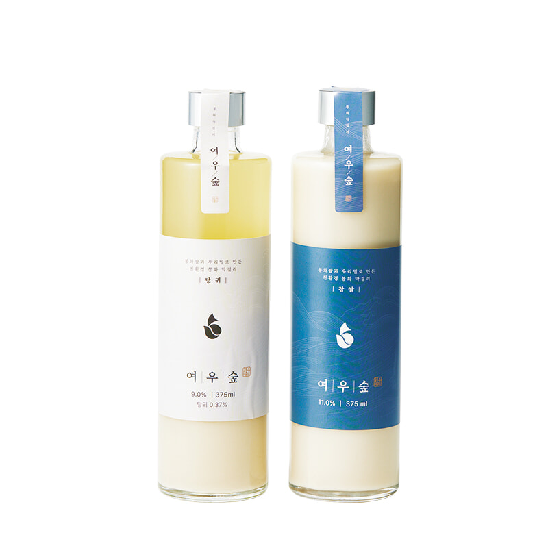 添加物を加えず伝統的な製法を引き継いだナチュラルなマッコリ。薬草のほろ苦さが漂うアルコール度数9%(左)は韓方焼肉などに、まろやかな甘みの度数11%(右)はチヂミやビビンパに。