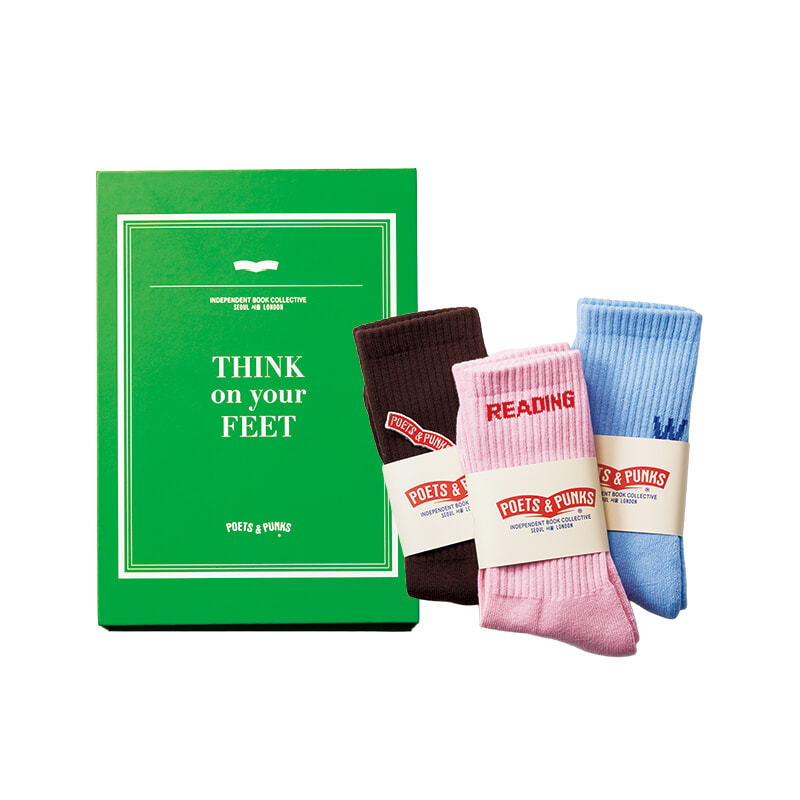 編集者が手がけるインディペンデントな出版社Poets & Punksのソックス。本にまつわるワードが描かれたキッチュな3足セット。ワッペン付き。