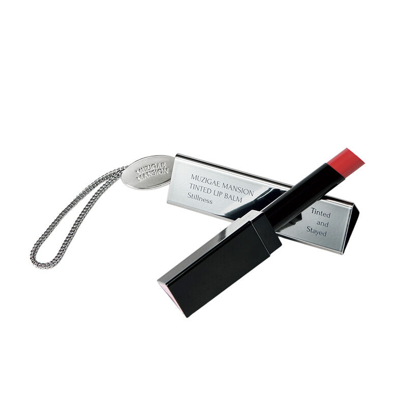 キャッチーなルックスで人気を博すムジゲ マンションの新リップはスリムなチェーン付きデザインが特徴。長時間崩れない唇を実現。全8色。