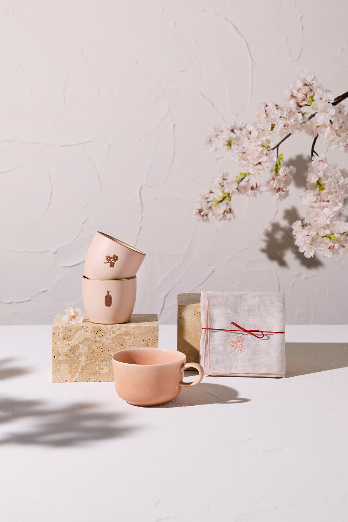 サクラ カップ ¥2,750、yumiko iihoshi porcelain for BLUE BOTTLE COFFEEサクラ ラテカップ ¥4,620、オリジナル 刺繍ハンカチ –SAKURA– ¥1,760/ブルーボトルコーヒー