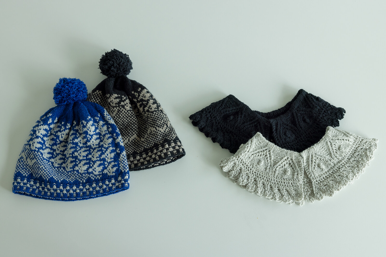 Miknitsで販売するキット。日本の伝統柄、千鳥文に着想を得たカシミアの帽子は左からdawn、dusk 各¥11,000。付け襟corridorブラック ¥6,050。グレーは終売。