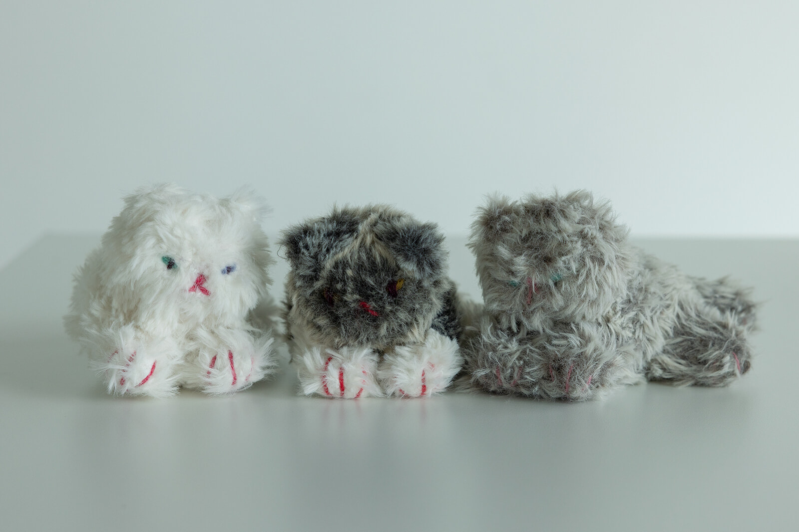 ファーヤーンを棒針で編んで作るkittens3種。左から、シロちゃん、タビちゃん、ペルシャさん 各¥2,970