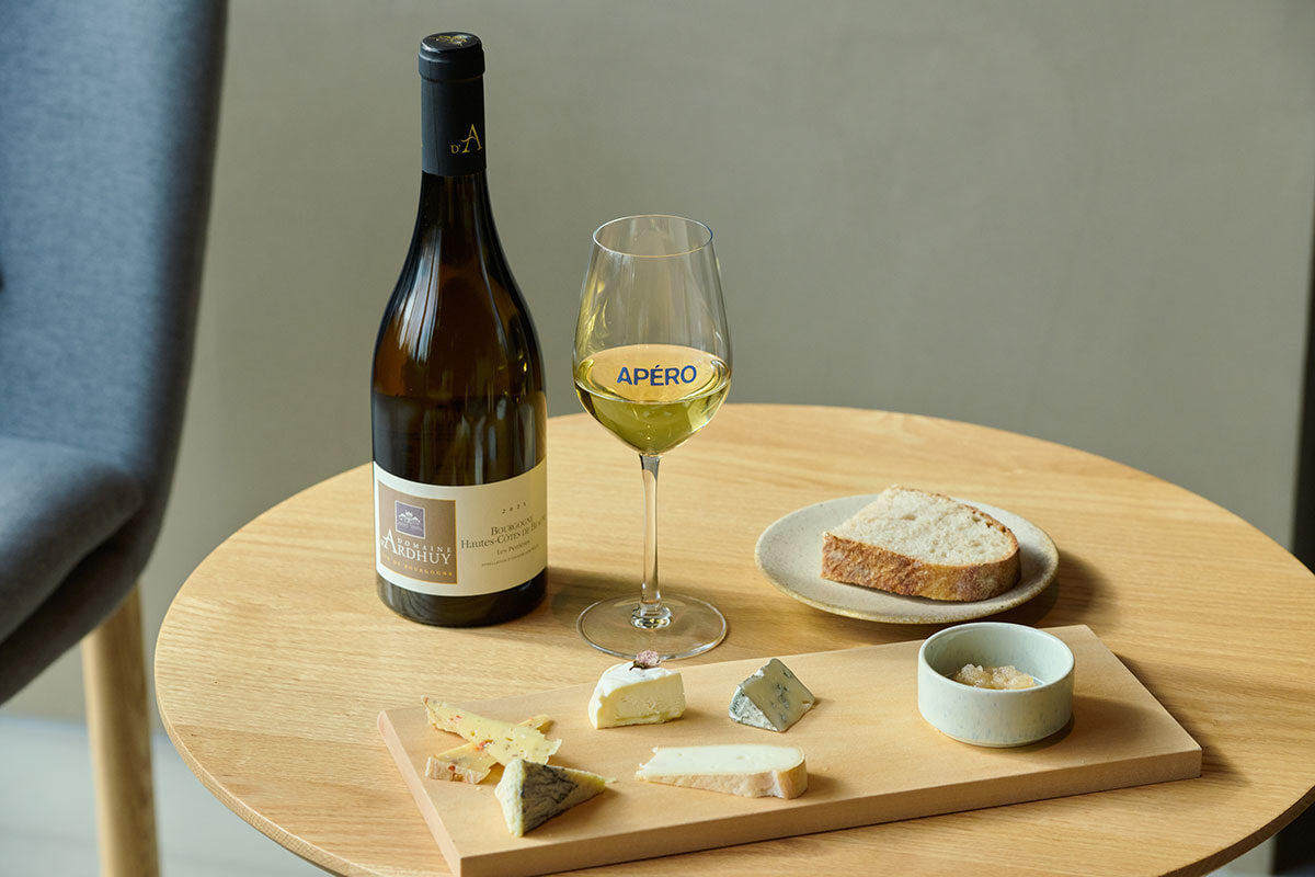 手前は「国産チーズ盛り合わせ」80g ¥2,590、奥は「ドメーヌ・ダルデュイ/ブルゴーニュ オート コート ド ボーヌ 2021」ボトル¥10,790、グラス¥2,190