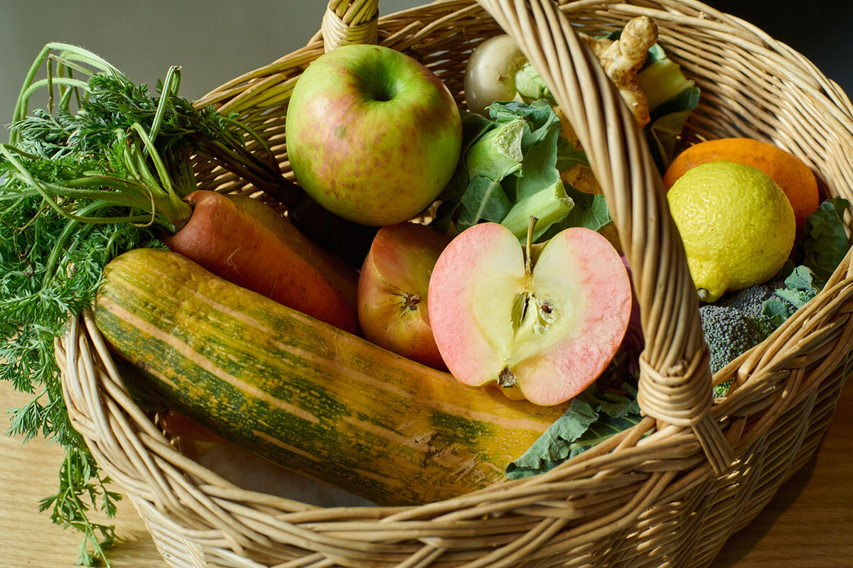 神奈川県横須賀市のSHOファームの野菜や、モクテルのシロップにも使っている愛媛県西予市、無茶々園の柑橘などをカゴいっぱいに。どちらも無農薬・無化学肥料の栽培。