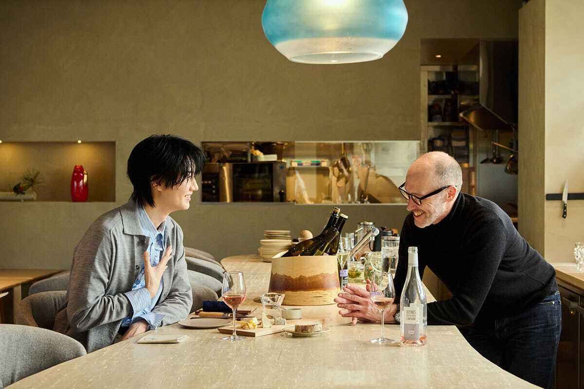 カウンター越しに会話を始めた桜田とギヨーム。「初対面ではなく、実は再会ですね!」と桜田。緩やかにカーブを描く木のカウンターは緊張を強いない。